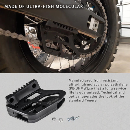 Beskyt din Yamaha Tenere 700 under barske off-road eventyr med denne kædeguidebeskytterplade. Fremstillet til at beskytte kæden og svingarmen mod sten, snavs og drivkraftpåvirkninger, hjælper den med at bevare kædens integritet og en jævn tandhjulsengagement på krævende terræn. Lavet af holdbart Ultra High Molecular Weight Polyethylene (UHMWPE) tilbyder denne beskyttelse langvarig beskyttelse uden at tilføje unødvendig bulk. Den slanke sorte plastikfinish, komplet med Tenere-logoet, giver et robust, integreret udseende samtidig med at den forbedrer holdbarheden på off-road stier. Egnet til Yamaha Tenere 700 efter 2019, er det en praktisk opgradering, der øger pålideligheden, hvor vejen ender.