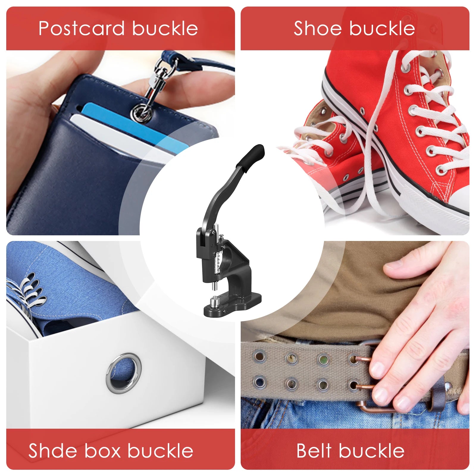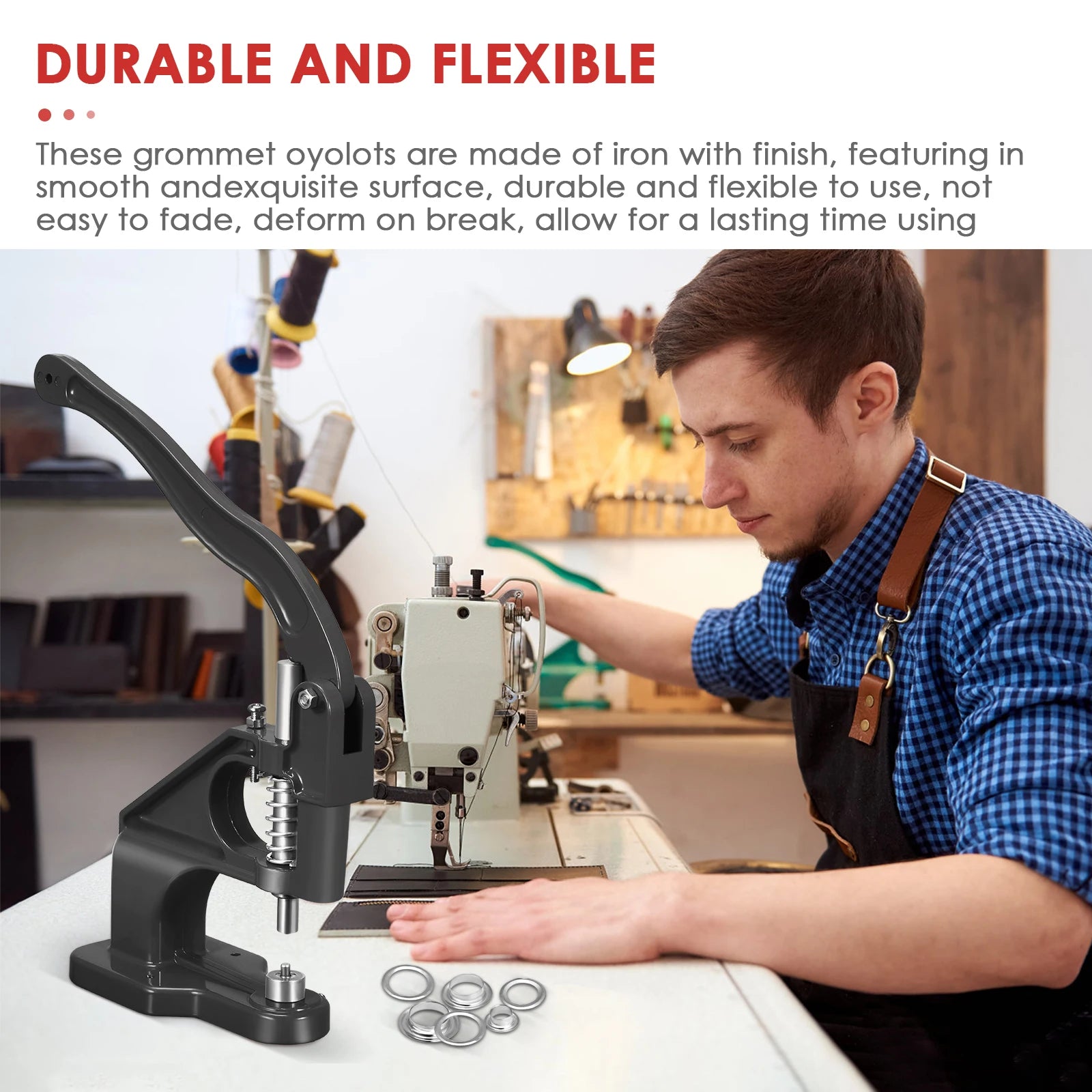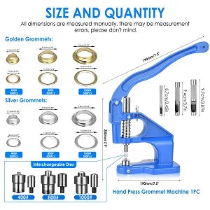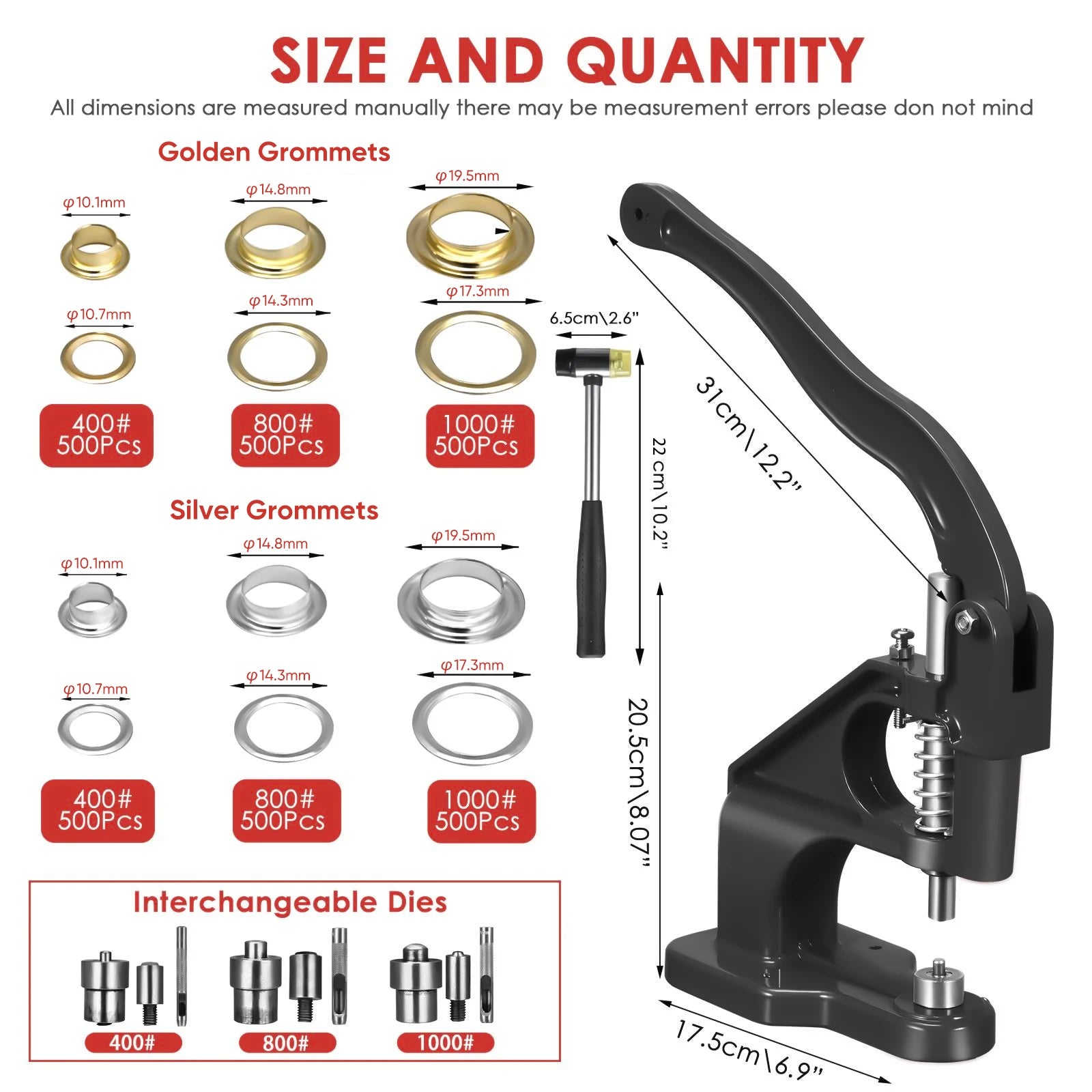 Opdag professionel alsidighed med Jugacool håndpresser til øskenmaskine. Denne kompakte, robuste håndpresser er designet til at levere rene, sikre øskner og nitter til læder, stof, tasker, bælter, bannere, skilte og mere. Den har 3 udskiftelige matrice (#0, #2, #4), der svarer til øsknestørrelser 1/4", 3/8" og 1/2" (6 mm, 10 mm, 12 mm), plus et sæt med 3000 knaphuller i to klassiske finish—sølv og guld. Pakken inkluderer også et slagværktøjssæt og en hammer, hvilket gør det til en komplet løsning for hurtige, præcise lukninger uden rod fra en manuel hulmaskine. Sammenlignet med traditionelle øsknetænger eller hamre indsætter denne håndpresser øskner dybere i materialet for holdbare resultater og en professionel finish.