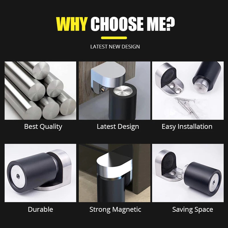 Mød det nyeste design magnetiske dørstopper i sort rustfrit stål 304 — en robust, vejrbestandig løsning designet til både indendørs og udendørs døre. Fremstillet af solidt 304 rustfrit stål, modstår det vand og vind, hvilket gør det holdbart i årevis, samtidig med at det beskytter gardiner, vægge og møbler mod dørens påvirkning.