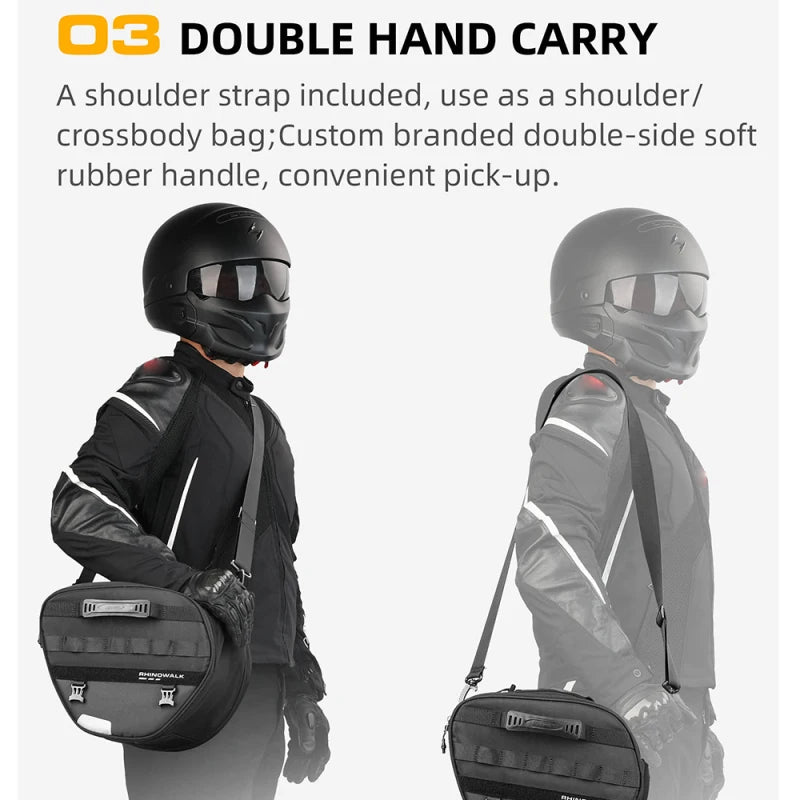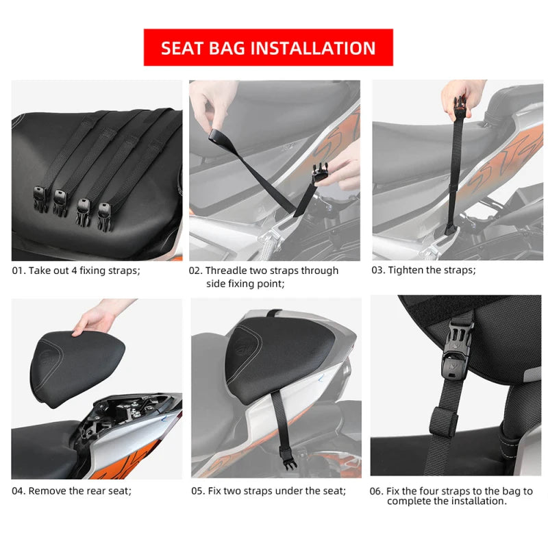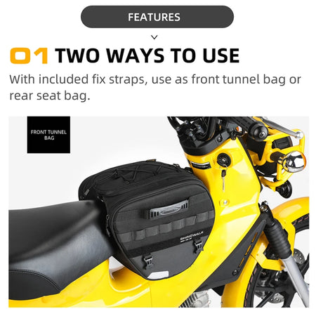 Dens 15L hovedrum plus et multirumdesign med elastiske snore gør det muligt at klassificere udstyr hurtigt. Den forreste tunnel taske kan monteres direkte eller fastgøres med klæbende tape, mens en aftagelig PE-plade hjælper med at forhindre, at genstande bliver knust. Når den bruges som en bagage, passer en simpel fire-punkts bæltefiksering til de fleste motorcykelmodeller. Reflekterende paneler og striber forbedrer synligheden om natten for en sikrere kørsel. Fremstillet af vandafvisende Dacron og udstyret med en regncover, beskytter tasken indholdet mod regn og sprøjt, mens den forbliver let og holdbar.