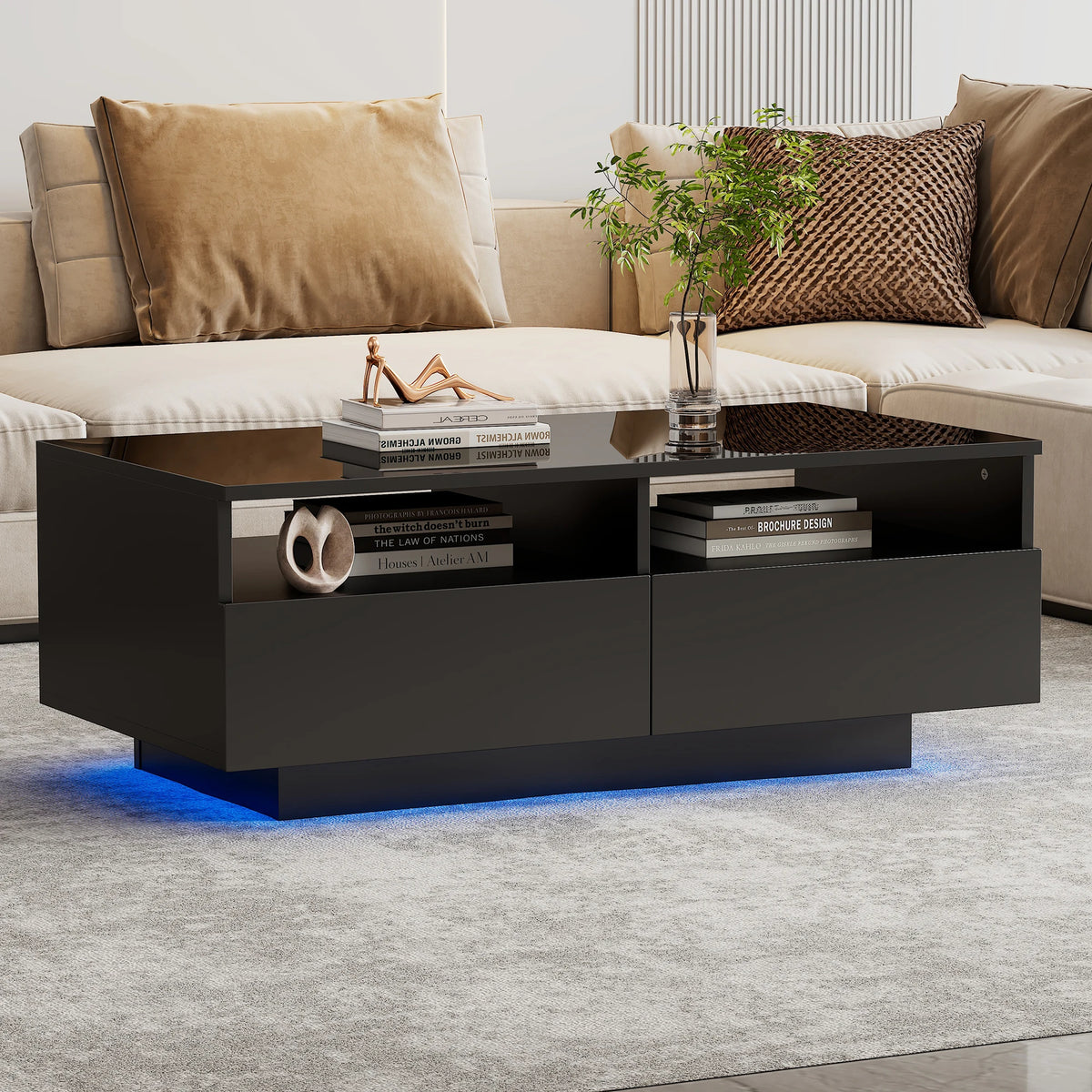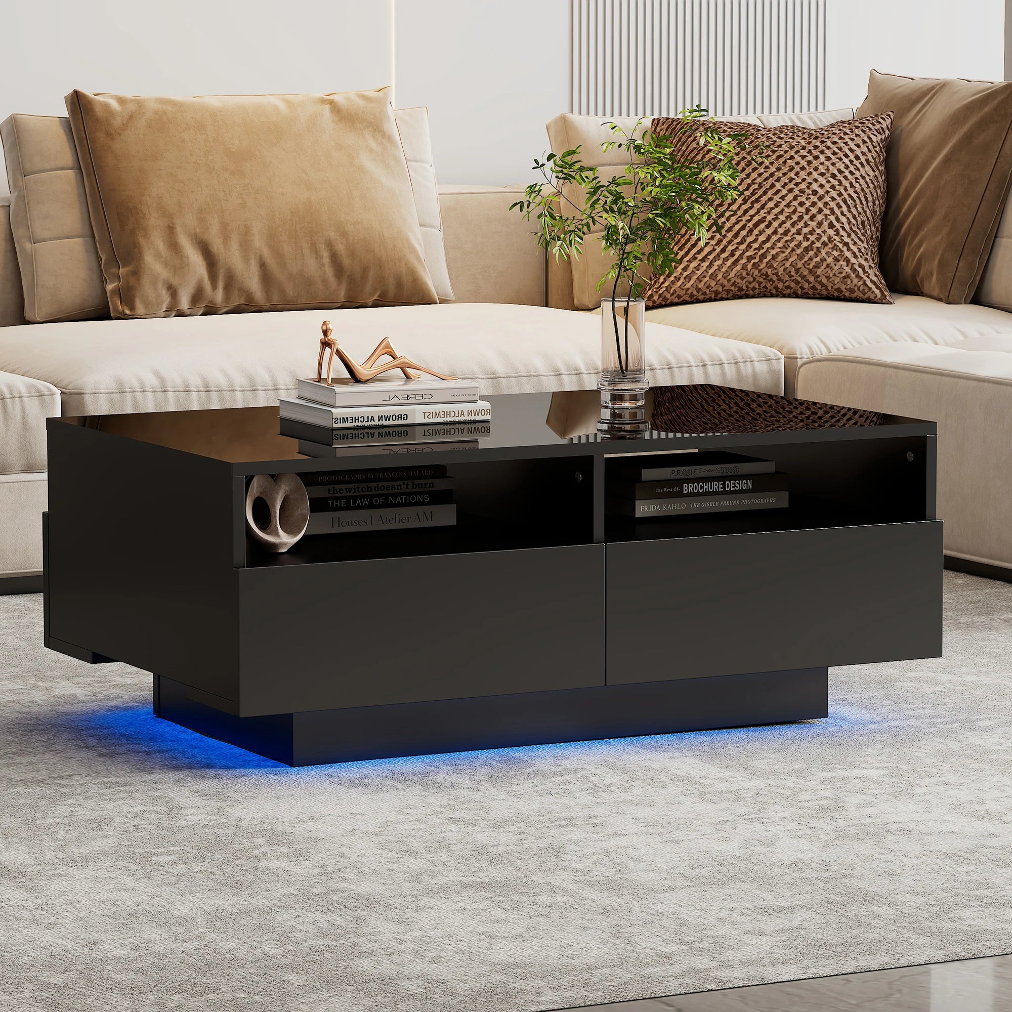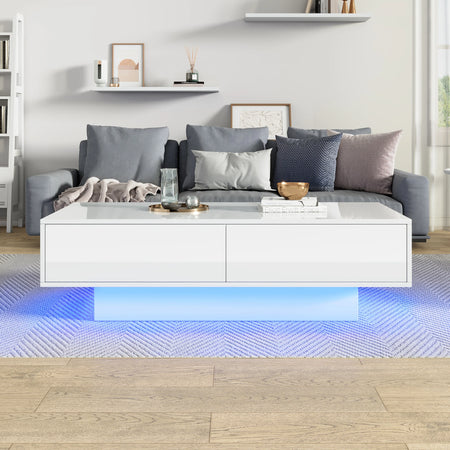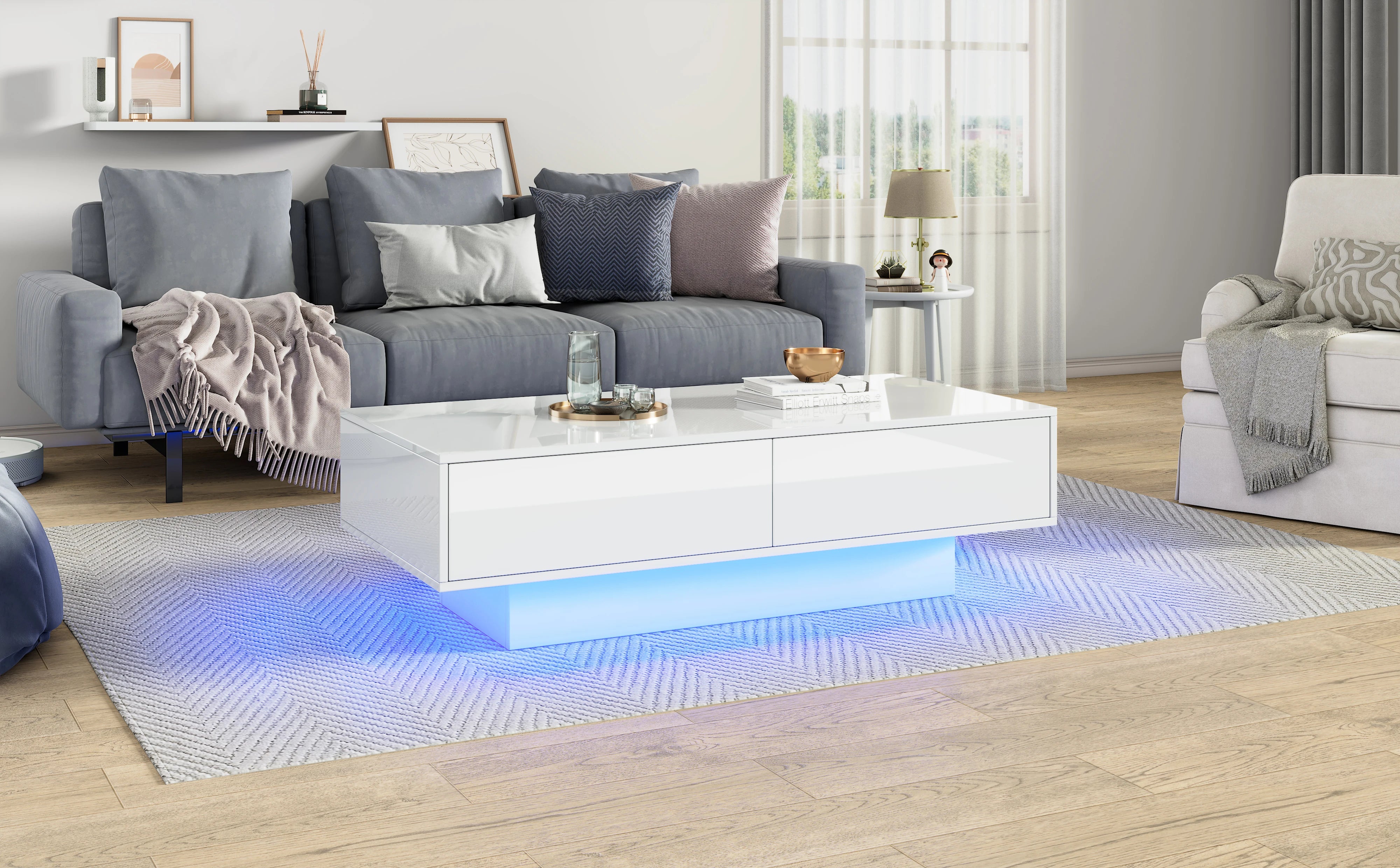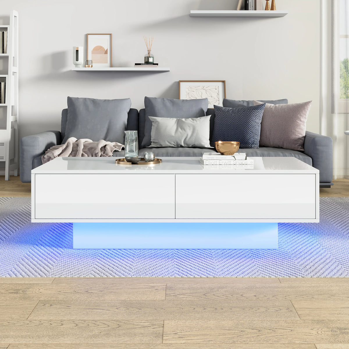 Højglans Hvid Kaffebord 115x55x34 Med 2 Skuffer LED