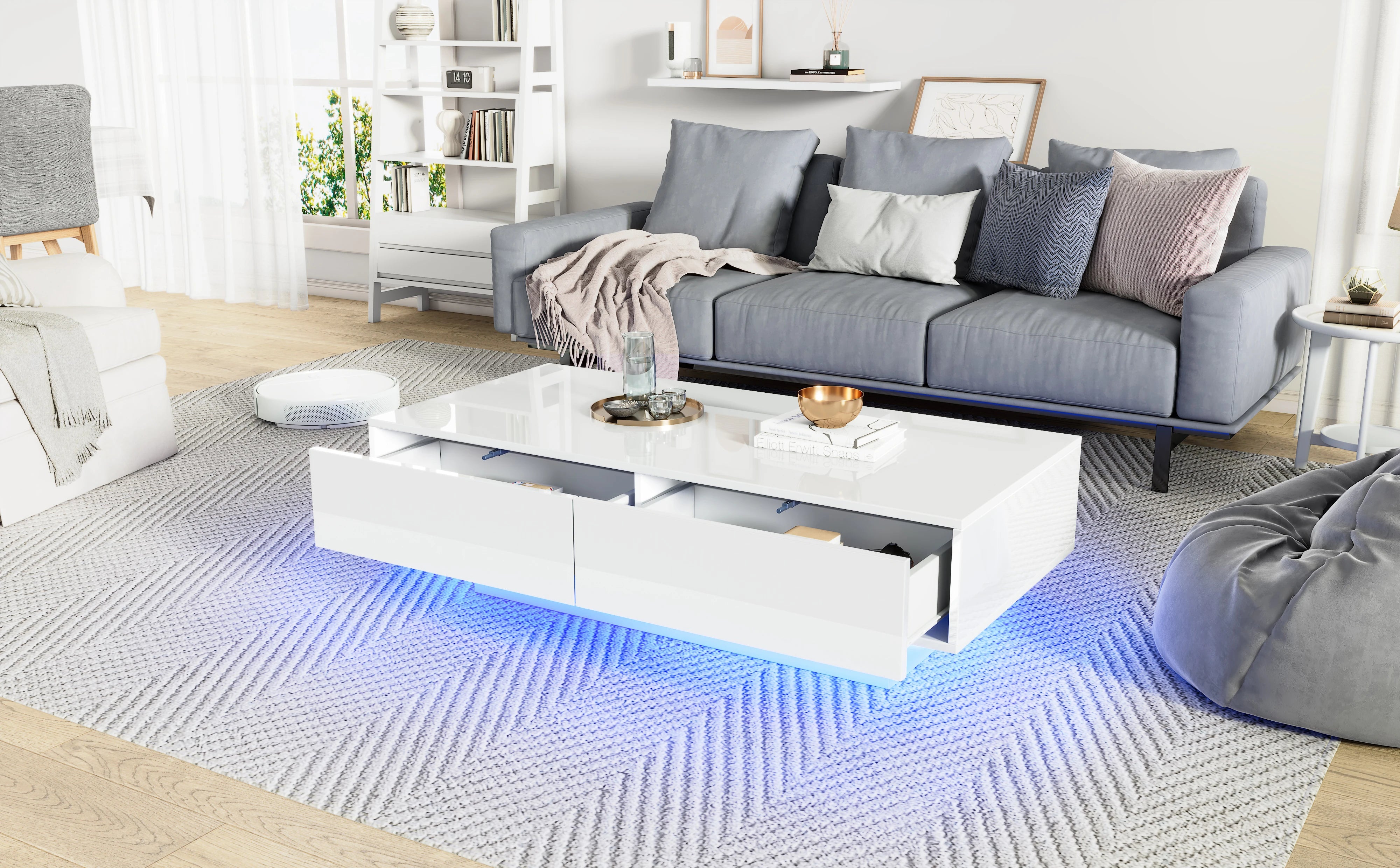 - Højt Blankt Hvidt Sofabord — 115 x 55 x 34 cm med 2 skuffer og integreret LED-belysning.