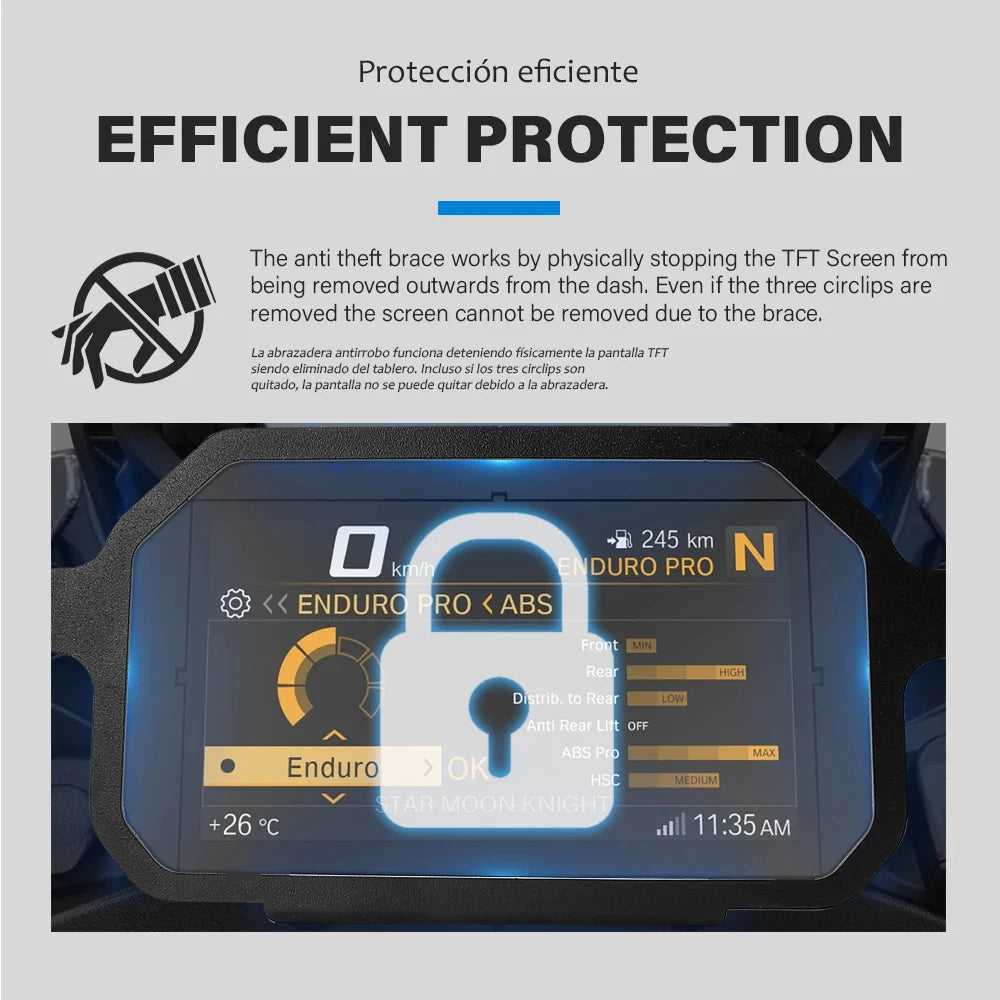 Beskytt din BMW F900R TFT-skærm med BMW F900R Instrument Guard med TFT Tyveribeskyttelses Skærmbeskytter, et holdbart målerammebeskyttelse designet til at afskrække tyveri og beskytte cockpitens dyreste komponent mod skader.