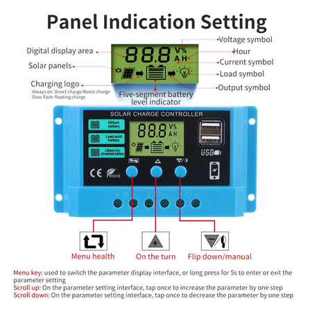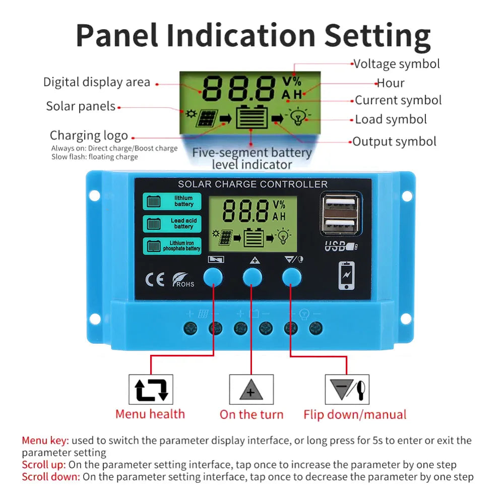 Designet til en bred vifte af batterikemier, understøtter den forskellige blysyre muligheder, lithiumbatterier og 12V genopladelige celler (inklusive åbne og forseglede gelvarianter). Enheden vælger automatisk 12V eller 24V drift, hvilket forenkler installationen i hjem, hytter, campingvogne eller både. Indbygget beskyttelse inkluderer overstrøm, kortslutning, åben kreds og omvendt tilslutningsbeskyttelse, som alle er selvhelende og designet til at forhindre skader på controlleren. Et dobbelt MOS anti-tilbagestrømskredsløb forhindrer energi i at flyde tilbage til panelerne, hvilket hjælper med at opretholde lav varmeudvikling og stabil ydeevne. Alt elektronisk og mekanisk udstyr, apparater og maskiner solgt af InterCyprus til EU-lande er CE-certificeret og har en to-års garanti.