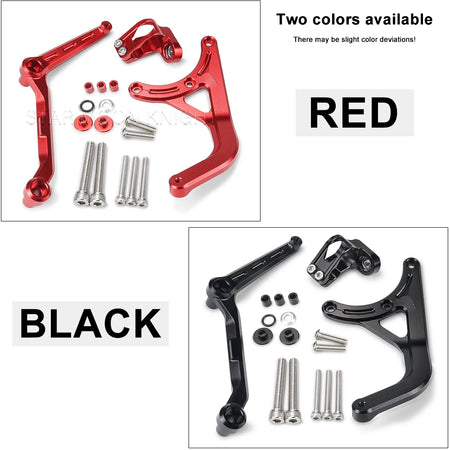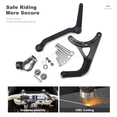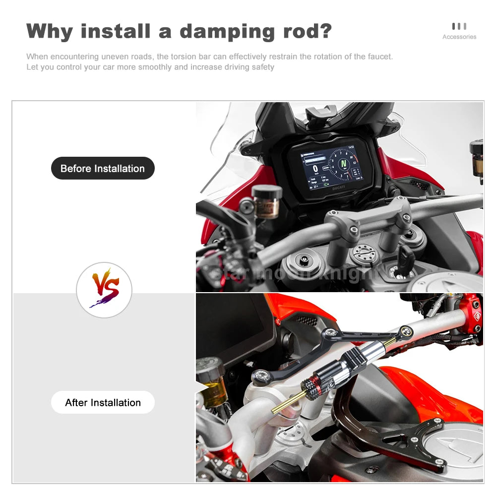 Opgrader din Ducati Multistrada V4's køretryghed med Steering Damper Bracket Kit fra Star Moon Knight. Designet til V4-familien — inklusive V4, V4S, V4S Pikes Peak, V4 Rally og V4 Grand Tour — giver dette sæt et sikkert monteringspunkt til en styredæmper (dæmper ikke inkluderet). Fremstillet af robust T6061 aluminium legering og færdiggjort i en iøjnefaldende Sort/Rød, integrerer beslaget sig med din motorcykels ramme for at dæmpe lateral bevægelse og udjævne højhastigheds, snoede terræner. Mens dine forgaffler håndterer vertikale stød, hjælper styredæmperbeslaget med at kontrollere aggressive styreinput, hvilket reducerer tank slappers og førertræthed for sikrere og mere kontrolleret kørsel. Husk, dette sæt inkluderer beslag og bolte; selve støddæmperen er ikke inkluderet, så bekræft venligst, at du kun har brug for beslagene, før du bestiller.