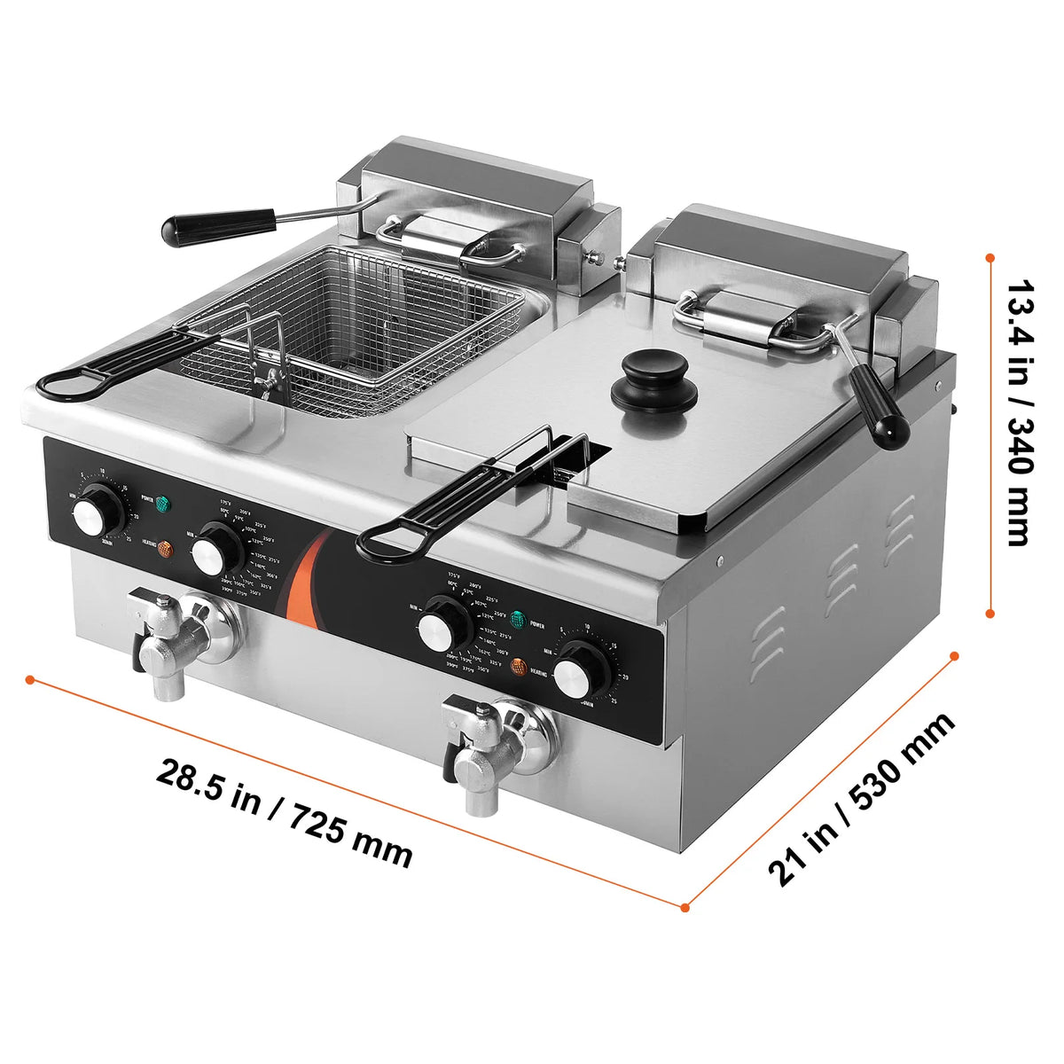Mød 2 x 9QT Dual Tank Electric Countertop Fryer—den kompakte, højkapacitetsløsning designet til travle små virksomhedskøkkener. Med to uafhængige olietanke kan du friturestege forskellige fødevarer side om side uden smagsoverførsel, hvilket øger menuens alsidighed for delikatesseforretninger, koncessionsboder, snackbarer og fester. Dens rustfrie ståludvendig rengøres nemt mellem travle perioder, mens to frontmonterede drænvæsker gør olieafskaffelse hurtig og uden rod.