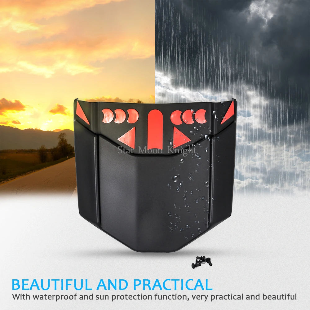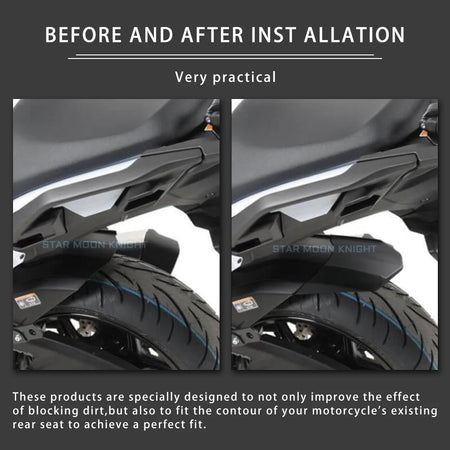Den fastgøres til din motorcykels OEM bagskærm med dobbeltsidet tape for et rent, sømløst udseende. Til en sikker installation skal du bruge et 3,8 mm bor og tre plastik Liu-søm til at fastgøre forlængeren.