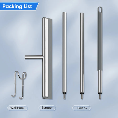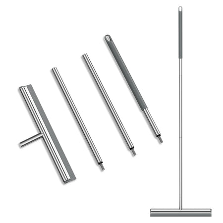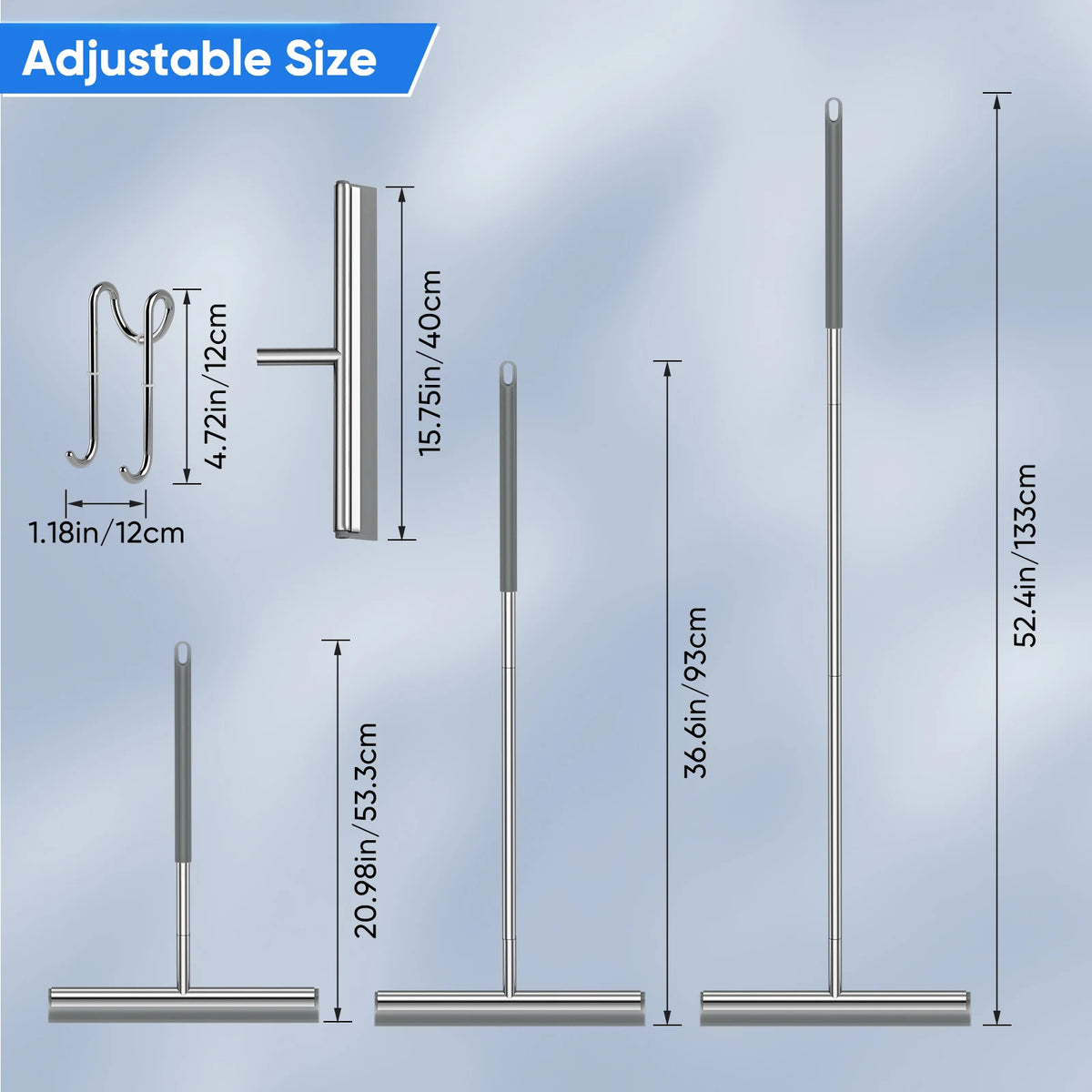 Dets rustbestandige design sikrer lang levetid, mens den skridsikre konstruktion garanterer stille, glat rengøring. Det justerbare håndtag kan forlænges fra 53,3 cm til 133 cm, så du kan nå høje vinduer, brusedøre og andre svært tilgængelige områder uden anstrengelse. Squeegee-længden er 40 cm, og sættet inkluderer tre forlængelsesstænger til at tilpasse din rækkevidde. Til opbevaring giver en rustbestandig krog dig mulighed for at hænge den på glasdøre eller vægge — uden boring.