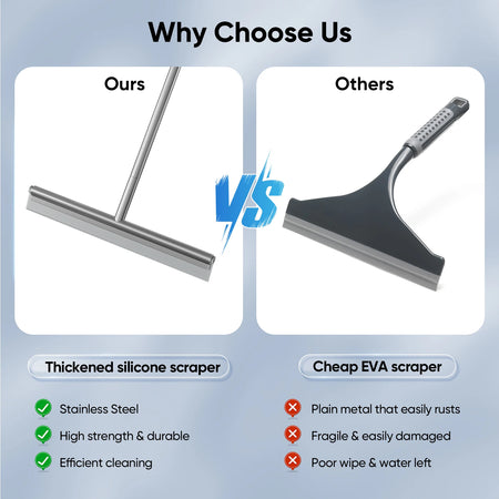 - Stribefri finish med stille betjening: Det skridsikre silikonehåndtag og silikonebladet arbejder sammen for at minimere støj og forhindre ridser, mens glas og fliser efterlades stribefri.