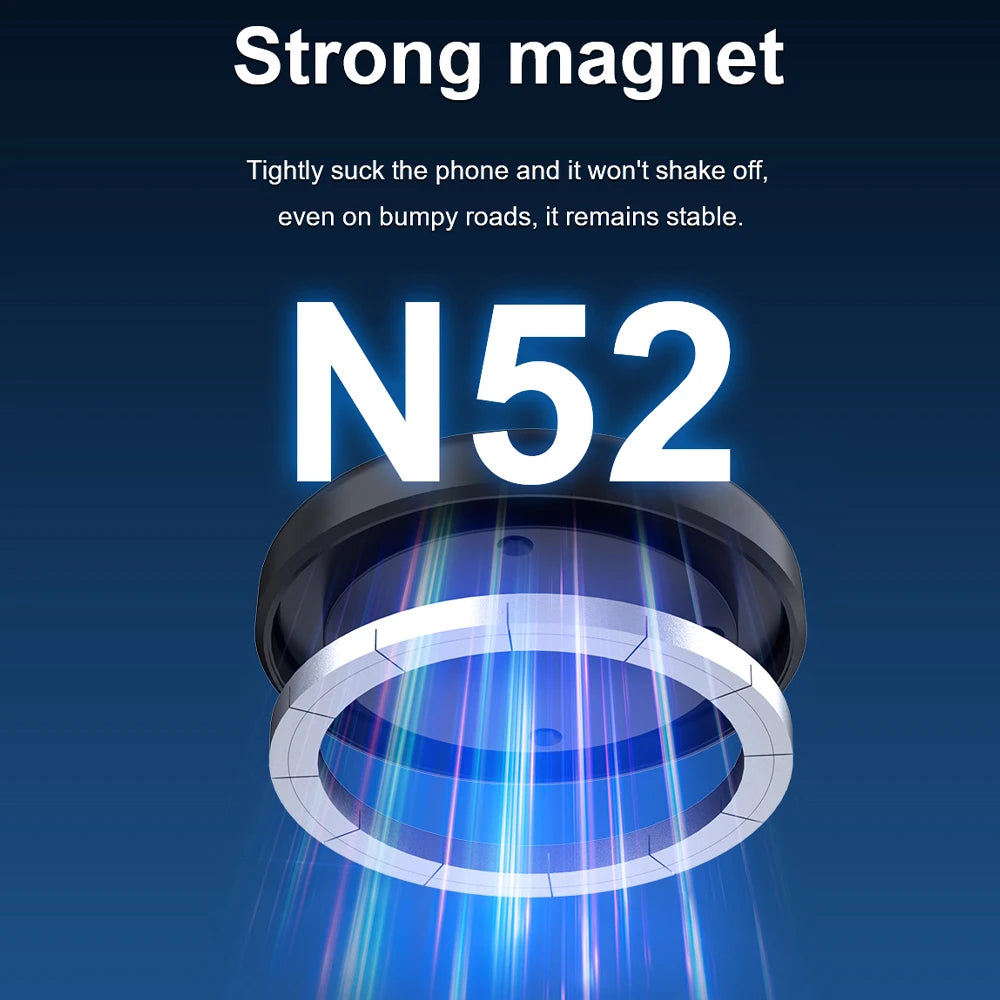 - Stærk Magnetisk Hold: Udnytter en kraftfuld N52-magnet, der stramt griber fat i din telefon, hvilket sikrer, at den forbliver sikkert på plads, selv på ujævne veje.
