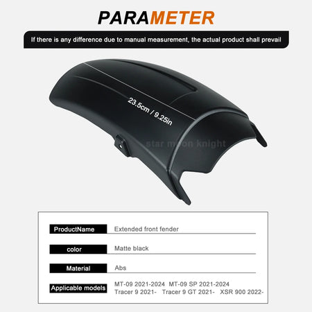 Specifikt designet til at forlænge beskyttelsen, hvor du har mest brug for det, tilføjer Fender Extender en 23,5 cm (9,25 in) forlængelse til din forreste skærm. Kombinationen af ABS-plast og kulstofstål giver holdbarhed og modstandsdygtighed mod vejens affald og sprøjt, hvilket hjælper med at bevare udseendet og ydeevnen på din Yamaha-motorcykel. Forlængerens pasform er universel til: Yamaha MT-09 2021-2024, MT-09 SP 2021-2024, Tracer 9 2021, Tracer 9 GT 2021 og XSR 900 2022. Dens installation følger den originale forreste skærms profil, så du får forbedret beskyttelse uden at ændre motorcyklens linjer eller vægtfordeling.