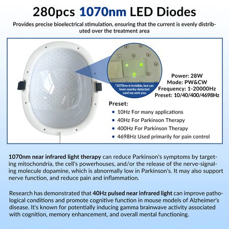 Enheden har fire forudindstillede frekvenser (10 Hz, 40 Hz, 400 Hz, 4698 Hz) med justerbare effekt niveauer (25%, 50%, 75%, 100%) og understøtter et bredt frekvensområde (1–20000 Hz) til personlig terapi. Den fungerer med 100–240V ved 50/60Hz input og tilbyder fleksible behandlingstider og tilstande, der passer til forskellige behov. Kombinationen af 280 dioder, der udsender 1070nm lys, op til 28W effekt og en kompakt, bærbar form gør den til en praktisk mulighed for at støtte hjernegenopretning, kognitiv funktion og humørregulering i hjemmet.