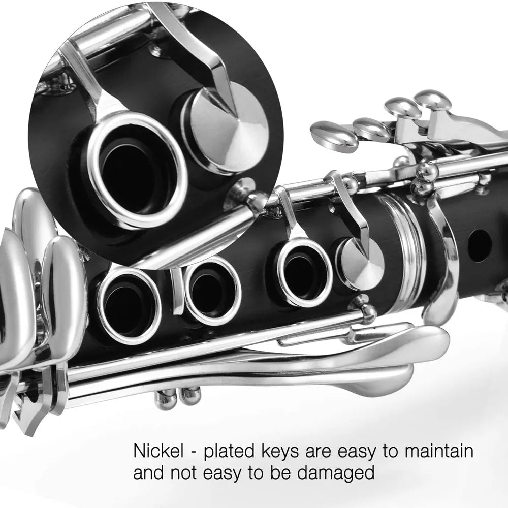 Κατασκευασμένο από ανθεκτικά υλικά, συμπεριλαμβανομένου του χαλκού-νικελίου και του μπακελίτη, αυτό το κλαρινέτο εγγυάται μακροχρόνια διάρκεια και αξιοπιστία. Ο κομψός μαύρος σχεδιασμός προσθέτει μια πινελιά κομψότητας στο σύνολο της απόδοσής σας. Είτε είστε έμπειρος καλλιτέχνης είτε ανερχόμενος μουσικός, αυτό το κλαρινέτο είναι ο τέλειος σύντροφος για να τελειοποιήσετε τις δεξιότητές σας και να δημιουργήσετε όμορφες μελωδίες.