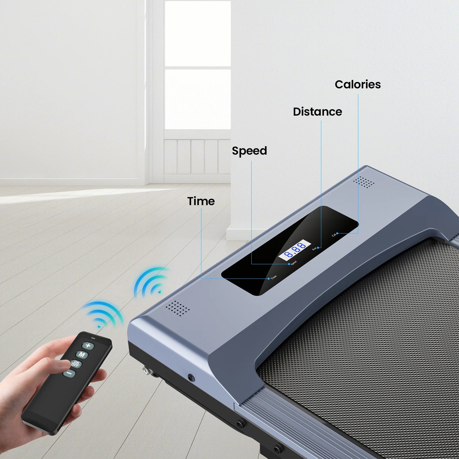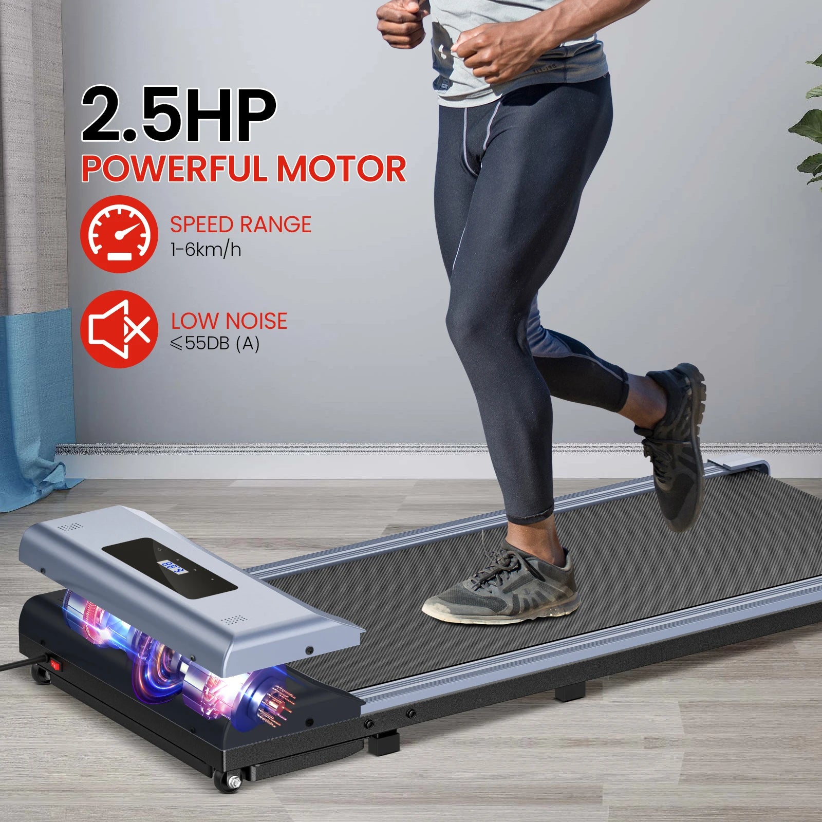 1-6km/h Περιοχή Τρεξίματος Τρέιλερ – Αναδιπλούμενος Σχεδιασμός Για Το Σπίτι — Ένα συμπαγές, αναδιπλούμενο ηλεκτρικό τρέιλερ σχεδιασμένο για οικιακή χρήση με μια πολυλειτουργική κονσόλα και μια φιλική προς τον χρήστη οθόνη. Ιδανικό για σταθερό περπάτημα και ελαφρύ τρέξιμο με ασφαλή εύρος ταχύτητας 1–6 km/h και χαρακτηριστικό αναδίπλωσης που εξοικονομεί χώρο.