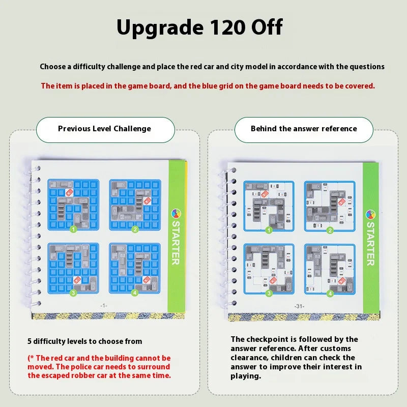 Ξεκλειδώστε ώρες διασκεδαστικής ενίσχυσης του εγκεφάλου με το Διαδραστικό Επιτραπέζιο Παιχνίδι Λογικής 120 Επιπέδων Αστυνομικός και Κλέφτης. Αυτή η συναρπαστική πρόκληση λογικής συνδυάζει στρατηγική, συμπερασματολογία και μια δόση ανταγωνιστικού παιχνιδιού για να κρατάει το μυαλό οξύ και τα χέρια απασχολημένα. Καθώς οι παίκτες προχωρούν σε 120 αυξανόμενα επίπεδα, εξασκούν τον προγραμματισμό βημάτων μπροστά, την πρόβλεψη κινήσεων και τη λήψη έξυπνων επιλογών υπό πίεση. Ιδανικό για οικογενειακές βραδιές παιχνιδιού, δραστηριότητες στην τάξη ή ατομικούς γρίφους, αυτό το παιχνίδι κάνει τη μάθηση μέσω του παιχνιδιού ευχάριστη και εθιστική.