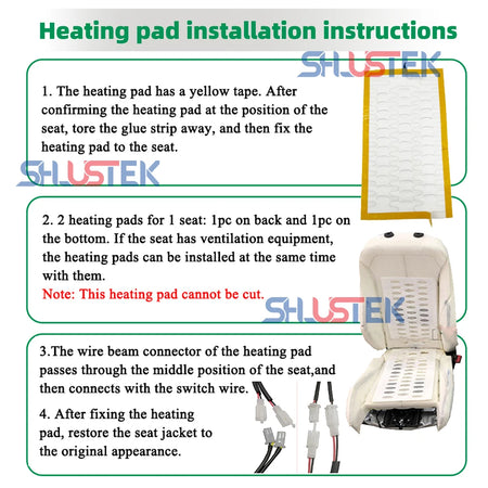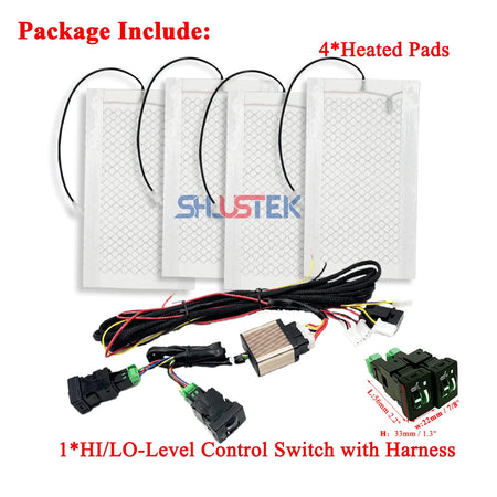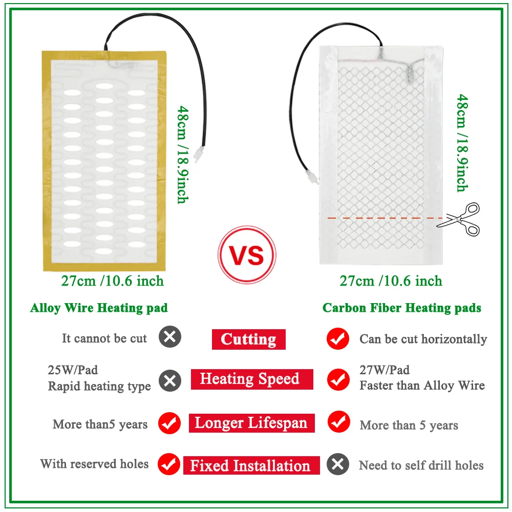 Σχεδιασμένο για συστήματα DC 12V, αυτό το καθολικό κιτ ταιριάζει στις περισσότερες αυτοκίνητα, SUV, φορτηγά, τροχόσπιτα και σκάφη. Το κιτ περιλαμβάνει έναν διακόπτη διπλής κεφαλής χωρίς βήματα, επιτρέποντας ομαλό έλεγχο on/off για δύο καθίσματα από μία τοποθεσία. Κάθε επιφάνεια παρέχει 25W θερμότητας για γρήγορη ζεστασιά και μεγάλη διάρκεια ζωής, με ασφαλή λειτουργία που αντέχει στη διάβρωση και τη ρωγμή. Οι διαστάσεις ανά επιφάνεια είναι περίπου 48 εκ. x 27 εκ. (18.9" x 10.6").