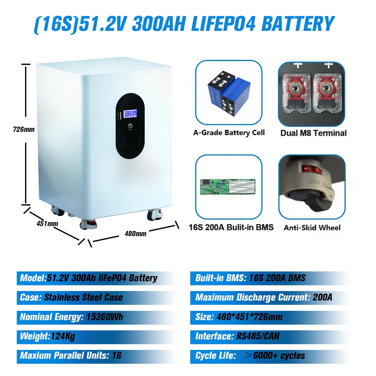 Αυτό το σύστημα 51.2V (16S) προσφέρει εντυπωσιακή ενέργεια 15.36 kWh με ονομαστική χωρητικότητα 300Ah, σχεδιασμένο να υποστηρίζει βασικές συσκευές κατά τη διάρκεια διακοπών ρεύματος, να τροφοδοτεί φορτία εκτός δικτύου ή να συμπληρώνει την ηλιακή αποθήκευση για μεγαλύτερη αυτονομία. Η μπαταρία έχει βαθμολογία IP5 για έκθεση σε σκόνη και νερό και είναι συμβατή με ευρύ φάσμα αντιστροφέων για ευέλικτη ενσωμάτωση. Μπορείτε να αυξήσετε τη χωρητικότητα συνδέοντας έως και 16 μονάδες παράλληλα για να κλιμακώσετε από 15.36 kWh σε πολύ μεγαλύτερο συνολικό ποσό, καθιστώντας την κατάλληλη για μεγαλύτερα σπίτια, εξοχικές κατοικίες ή εμπορικά έργα εκτός δικτύου.