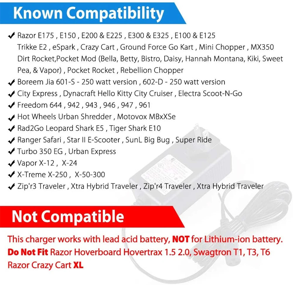 Ο Φορτιστής Ηλεκτρικού Σκούτερ 24V από NoEnName_Null παρέχει αξιόπιστη ενέργεια για να διατηρείτε τα ηλεκτρικά σκούτερ Razor σας σε ομαλή λειτουργία για διάφορα μοντέλα, συμπεριλαμβανομένων των E500, PR200, E225S, E325, E325S, E500S, MX350, MX400, Pocket Mod, Sports Mod και Dirt Quad.