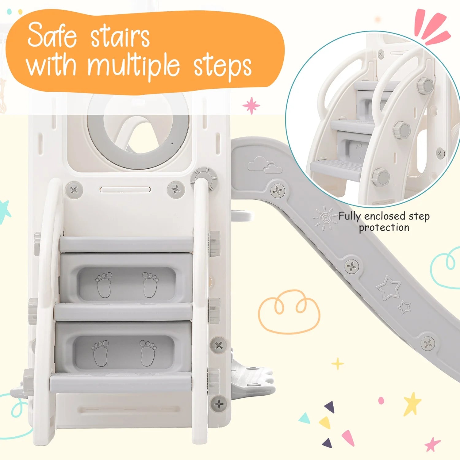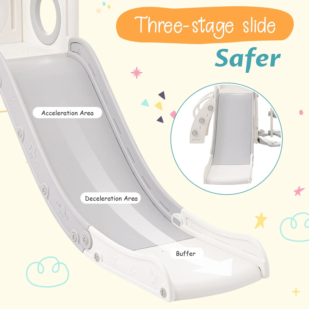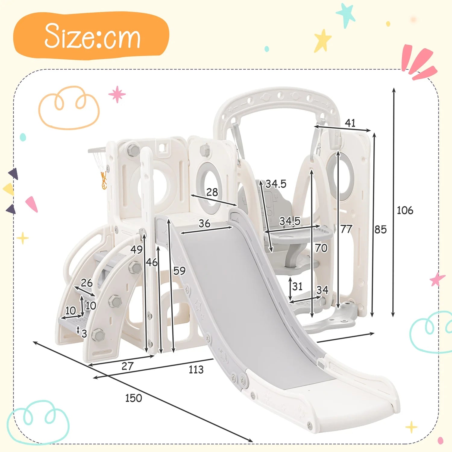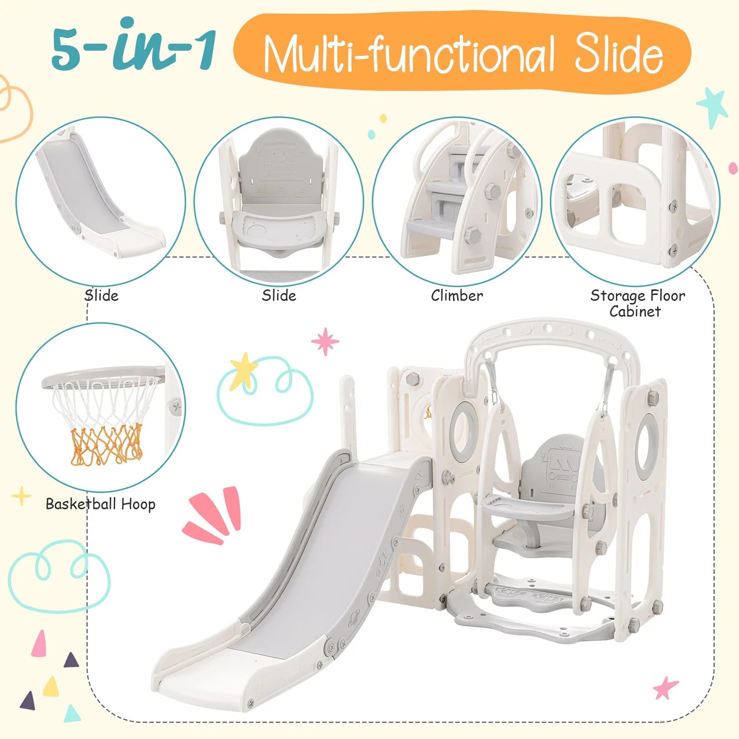 Το Παιδικό Σύστημα Τσουλήθρας, Κούνιας, Στεφανιού Μπάσκετ 5 σε 1 για εξωτερικούς χώρους είναι ένα ευέλικτο, εξοικονομούν χώρο σύστημα παιχνιδιού σχεδιασμένο να πυροδοτεί τη φαντασία και τη δραστήρια διασκέδαση για το παιδί σας. Αυτή η ολοκληρωμένη μονάδα συνδυάζει τσουλήθρα, κούνια, στεφάνι μπάσκετ, σκάλα για εύκολη αναρρίχηση και βάση ντουλαπιού για τακτοποίηση παιχνιδιών — προσφέροντας στα παιδιά μια πολυαισθητηριακή εμπειρία παιδικής χαράς σε ένα συμπαγές πλαίσιο. Κατασκευασμένο από ανθεκτικό HDPE με κομψό γκρι και λευκό φινίρισμα, αυτό το σετ 5-σε-1 είναι φτιαγμένο να αντέχει στο ενεργητικό παιχνίδι ενώ παραμένει απαλό για τα μικρά χέρια και γόνατα.