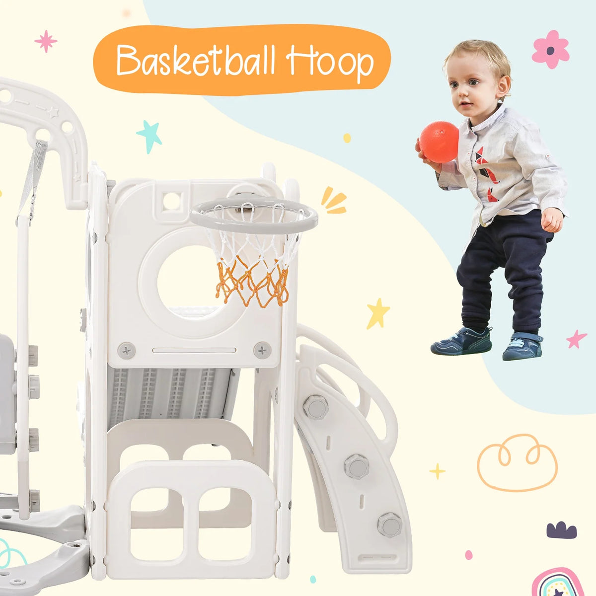 - Μονάδα παιδικής τσουλήθρας 5-σε-1 (HDPE) με τσουλήθρα, κούνια, σκάλα, στεφάνι μπάσκετ και βάση ντουλαπιού