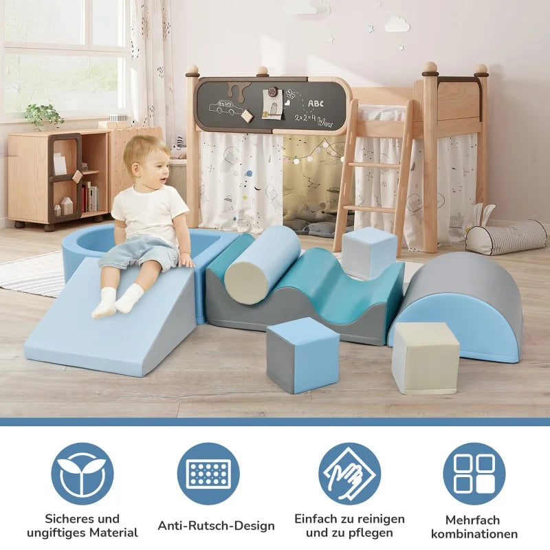 Ο σχεδιασμός συνδυασμού περιλαμβάνει εννέα ξεχωριστά κομμάτια που μπορούν να συναρμολογηθούν σε διάφορες μορφές για αναρρίχηση, ολίσθηση, σέρσιμο και φανταστικό παιχνίδι. Τα παιδιά μπορούν να εξερευνήσουν καμάρες, κύματα και μια μικρή πίστα εμποδίων, να ρίξουν ζάρια και να απολαύσουν μια εμπειρία μπάνιου με μπάλα, ενώ παράλληλα αναπτύσσουν ισορροπία, συντονισμό και κοινωνική αλληλεπίδραση.