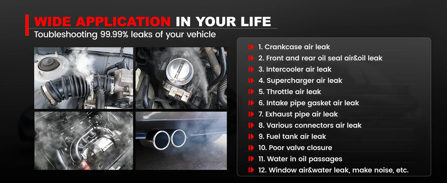 3. Ευρύ φάσμα εφαρμογών: Για την ανίχνευση διαρροών σε συστήματα σωληνώσεων σε αυτοκίνητα, μοτοσικλέτες, χιονομηχανές, οχήματα εκτός δρόμου, ATV, ελαφριά φορτηγά και ταχύπλοα. Λειτουργεί σε όλα τα μάρκες και μοντέλα αυτοκινήτων.