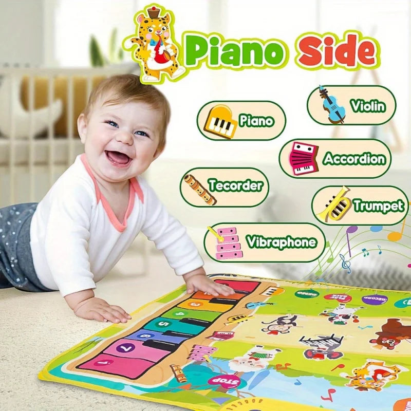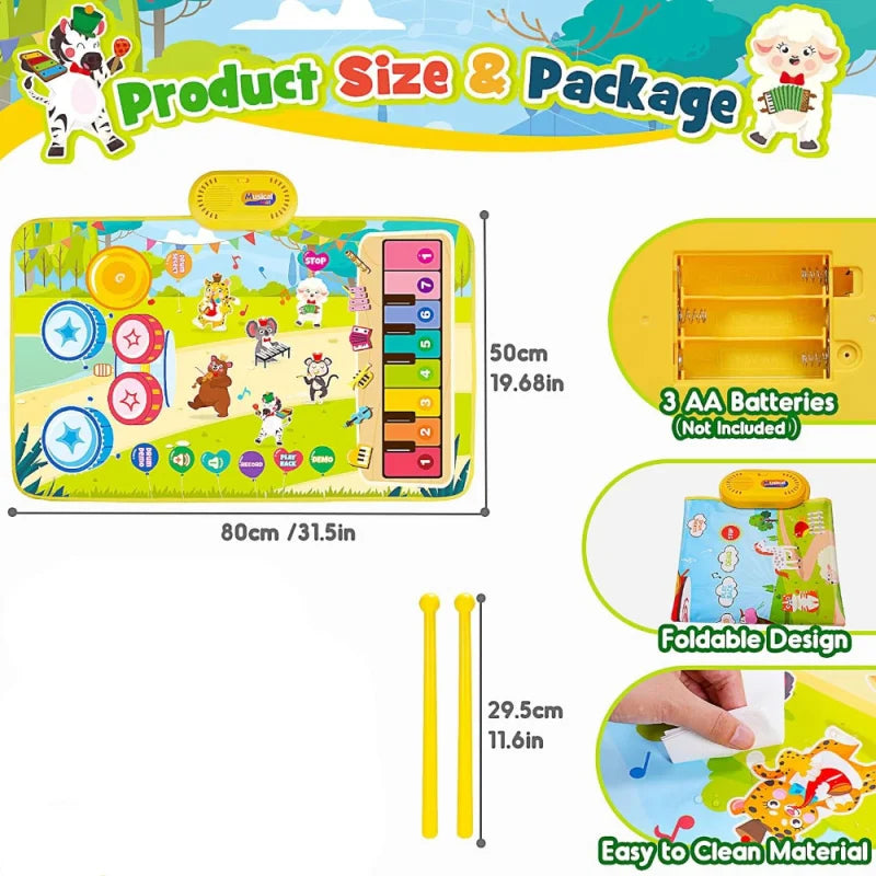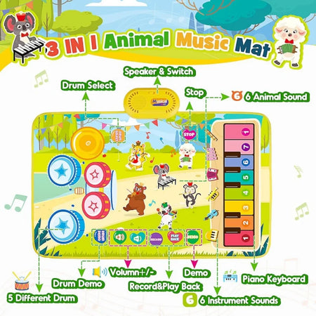 Μουσικό Παιδικό Χαλάκι, 3 σε 1 Πιάνο Δαπέδου Τύμπανο, Εκπαιδευτικό Παιχνίδι για Μωρά, Κουβέρτα με Ζώα για Άγγιγμα, Πλαστικό