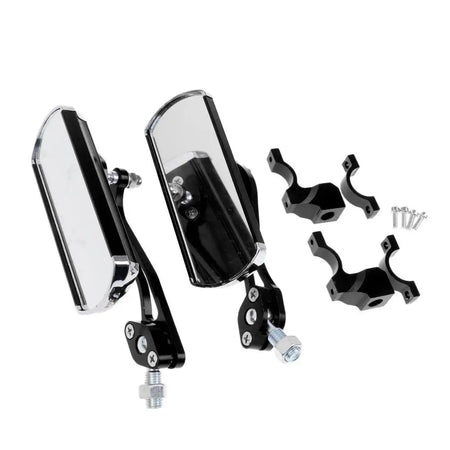 Σχεδιασμένοι για ευρεία συμβατότητα, αυτοί οι καθρέφτες ταιριάζουν σε τιμόνια με διάμετρο 22–24 mm και είναι κατάλληλοι για τα περισσότερα μοντέλα Μοτοσυκλετών, Street Bike, Scooter, Cruiser & Chopper που χρησιμοποιούν τυπικές μετρικές βίδες. Το μέγεθος της βίδας καθρέφτη είναι 10 mm και το μέγεθος εμφάνισης 125 × 50 mm. Το υλικό καλύμματος καθρέφτη είναι κράμα αλουμινίου και ο ίδιος ο καθρέφτης είναι από γυαλί, με μαύρο φινίρισμα για κομψή, χαμηλού προφίλ εμφάνιση. Πρόκειται για έναν αναβαθμισμένο καθρέφτη οπισθοπορείας προοριζόμενο για ποδήλατα, ηλεκτρικά αυτοκίνητα και μοτοσυκλέτες.
