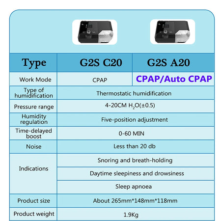 - Μοντέλα: G2S A20 (αυτόματη ρύθμιση πίεσης με ενσωματωμένο υγραντήρα και ασύρματη συνδεσιμότητα); G2S C20 (σταθερή πίεση με ενσωματωμένο υγραντήρα και ασύρματη συνδεσιμότητα)