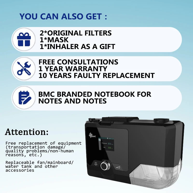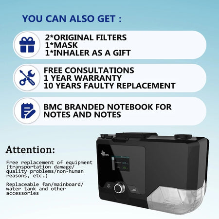 Γνωρίστε τη Μηχανή BMC G2S Αυτόματο CPAP με Κιτ Μάσκας κατά του Ροχαλητού — ένα συμπαγές, πιστοποιημένο CE σύστημα θεραπείας ύπνου σχεδιασμένο για αποτελεσματική διαχείριση του ροχαλητού και της άπνοιας ύπνου στο σπίτι. Εάν εσείς ή ένα αγαπημένο σας πρόσωπο αντιμετωπίζετε ροχαλητό, υπνηλία κατά τη διάρκεια της ημέρας, υπέρταση ή πονοκεφάλους το πρωί, αυτή η συσκευή βοηθά στη σταθεροποίηση των αεραγωγών σας κατά τη διάρκεια της νύχτας, προάγοντας βαθύτερη ανάπαυση και πιο καθαρές πρωινές ώρες.
