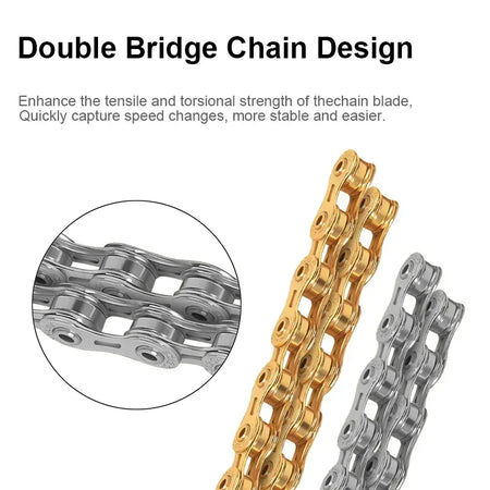- Κύρια χαρακτηριστικά: Σχεδίαση διπλής γέφυρας αλυσίδας; Λαμπερό ασημί/χρυσό; Ενισχυμένος κρίκος; Κούφιοι άξονες αλυσίδας; Τεχνολογία αντοχής στη φθορά; Εξαιρετικά ελαφριά