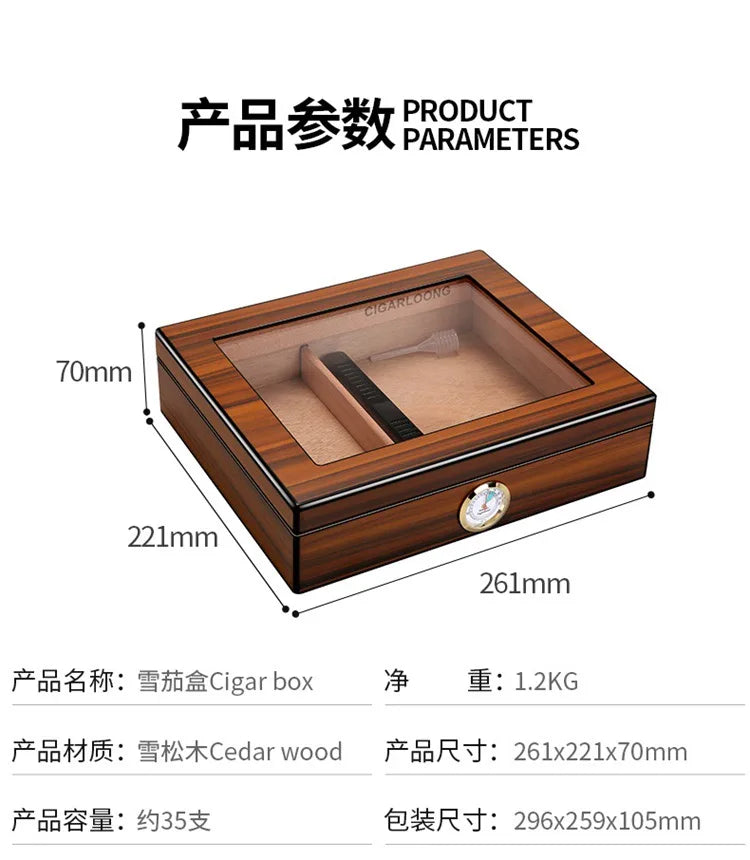 Αναβαθμίστε τη συλλογή πούρων σας με το Κουτί Υγραντήρα Πούρων από Κέδρο με Μεγάλο Παράθυρο και Φινίρισμα Πιάνο. Κατασκευασμένο από συμπαγές ξύλο και φινιρισμένο με πλούσιο σκούρο καφέ γυαλιστερό φινίρισμα πιάνο, αυτός ο υγραντήρας προσφέρει ένα καθαρό, μεγάλο παράθυρο προβολής για να θαυμάζετε τα πούρα σας με μια ματιά. Το μοντέλο CLA-21KY11, που προέρχεται από την ηπειρωτική Κίνα, συνδυάζει το στυλ εμπνευσμένο από την Ιαπωνία με τη σύγχρονη κομψότητα. Ιδανικό ως δώρο γάμου ή ως κομψό διακοσμητικό γραφείου, αποθηκεύει τα πούρα με ασφάλεια ενώ αναβαθμίζει οποιονδήποτε χώρο εργασίας ή μπαρ.