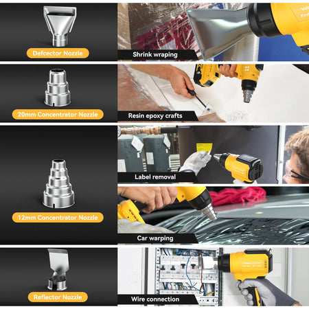 - Χρησιμοποιήστε την ποικιλία μύτων για να προσαρμόσετε τη ροή αέρα και τη διανομή θερμότητας για ακριβή συρρίκνωση, περιτύλιξη ή προετοιμασία επιφάνειας.