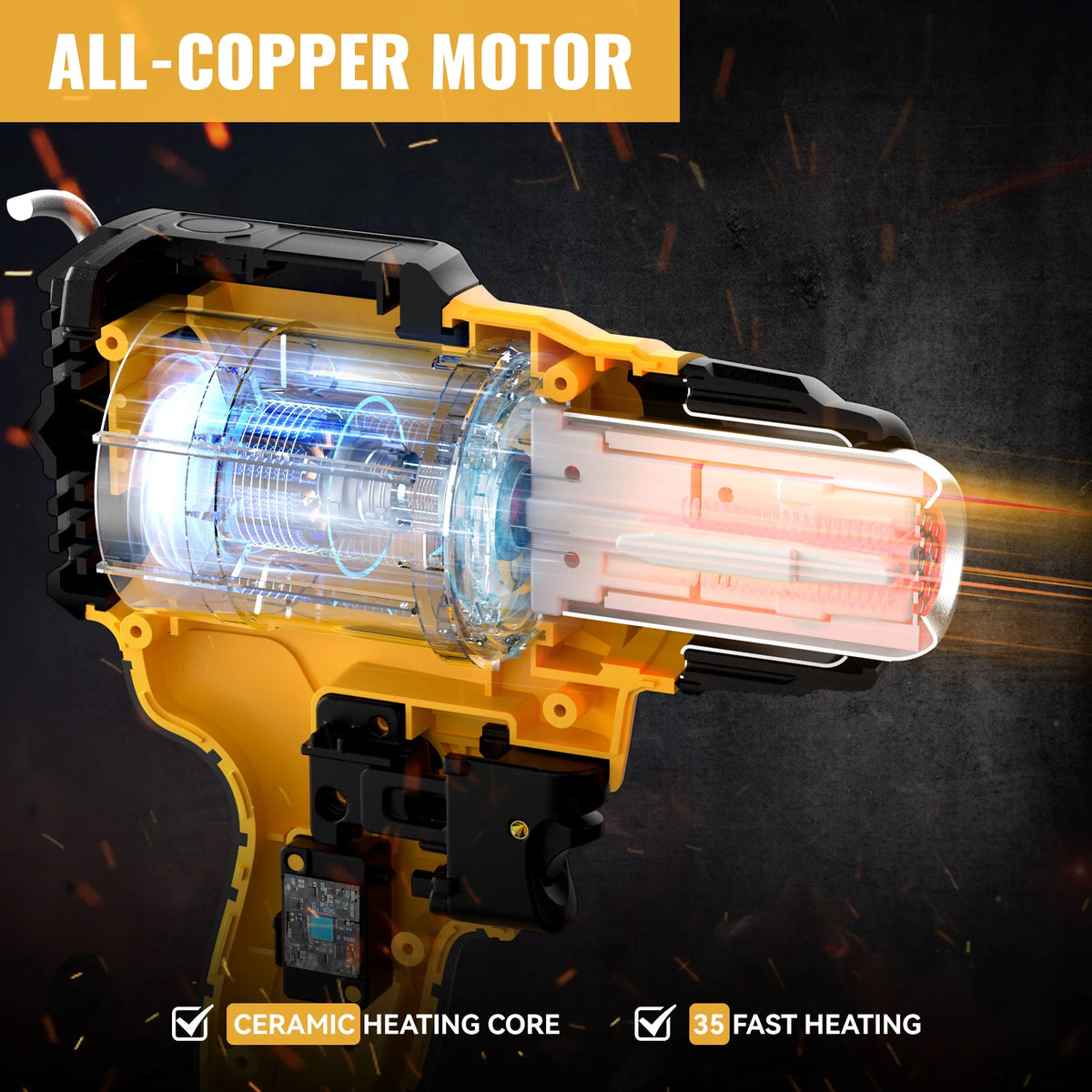- Γρήγορη θέρμανση για να ολοκληρώσετε τα έργα πιο γρήγορα — τέλειο για συρρίκνωση θερμότητας, αφαίρεση ετικετών και χειροτεχνίες ρητίνης.