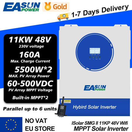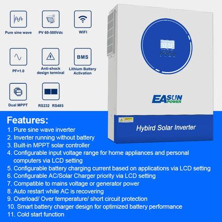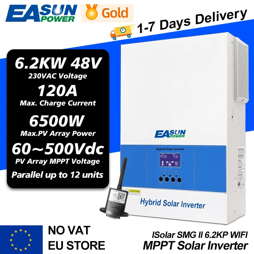 - 1 x EASUN 48V 6200W Υβριδικός Αντιστροφέας Dual MPPT 160A WiFi 220V