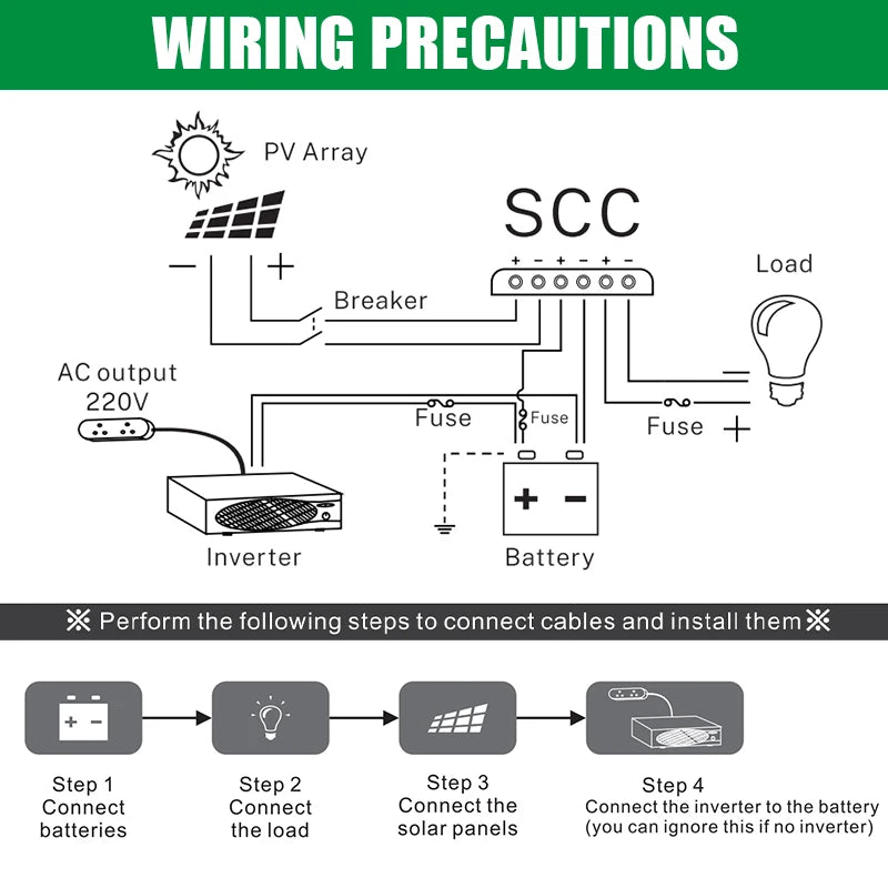 - Τηρήστε τη σωστή καλωδίωση για να ενεργοποιήσετε τις ενσωματωμένες προστασίες (πολικότητα, προστασίες βραχυκυκλώματος και προστασία υπερφόρτισης).