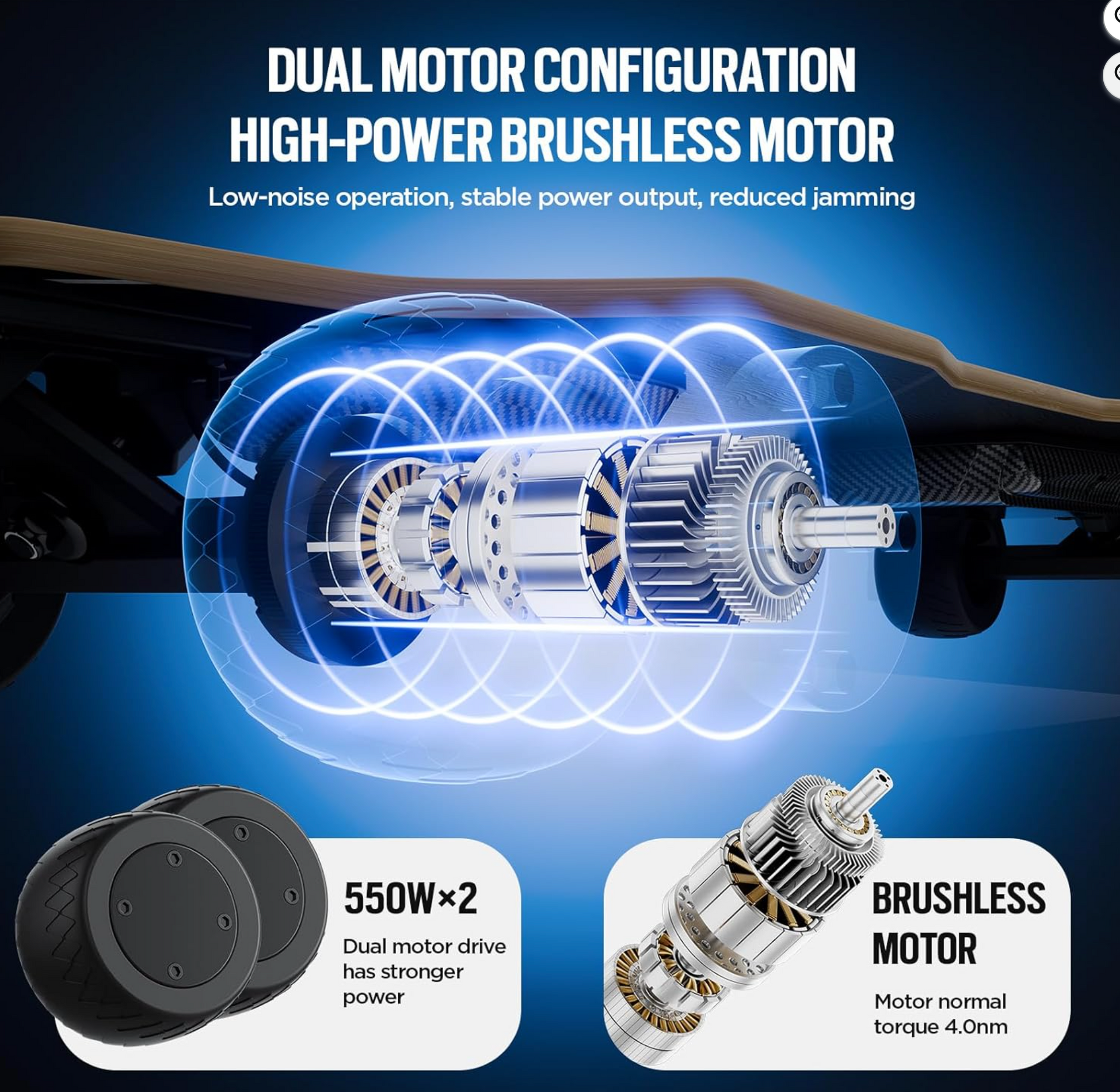 - Διπλή ισχύς κινητήρα: Δύο κινητήρες 550W υψηλής απόδοσης (4.0 Nm ροπή ο καθένας) ικανοί να αντιμετωπίσουν κλίσεις 20°