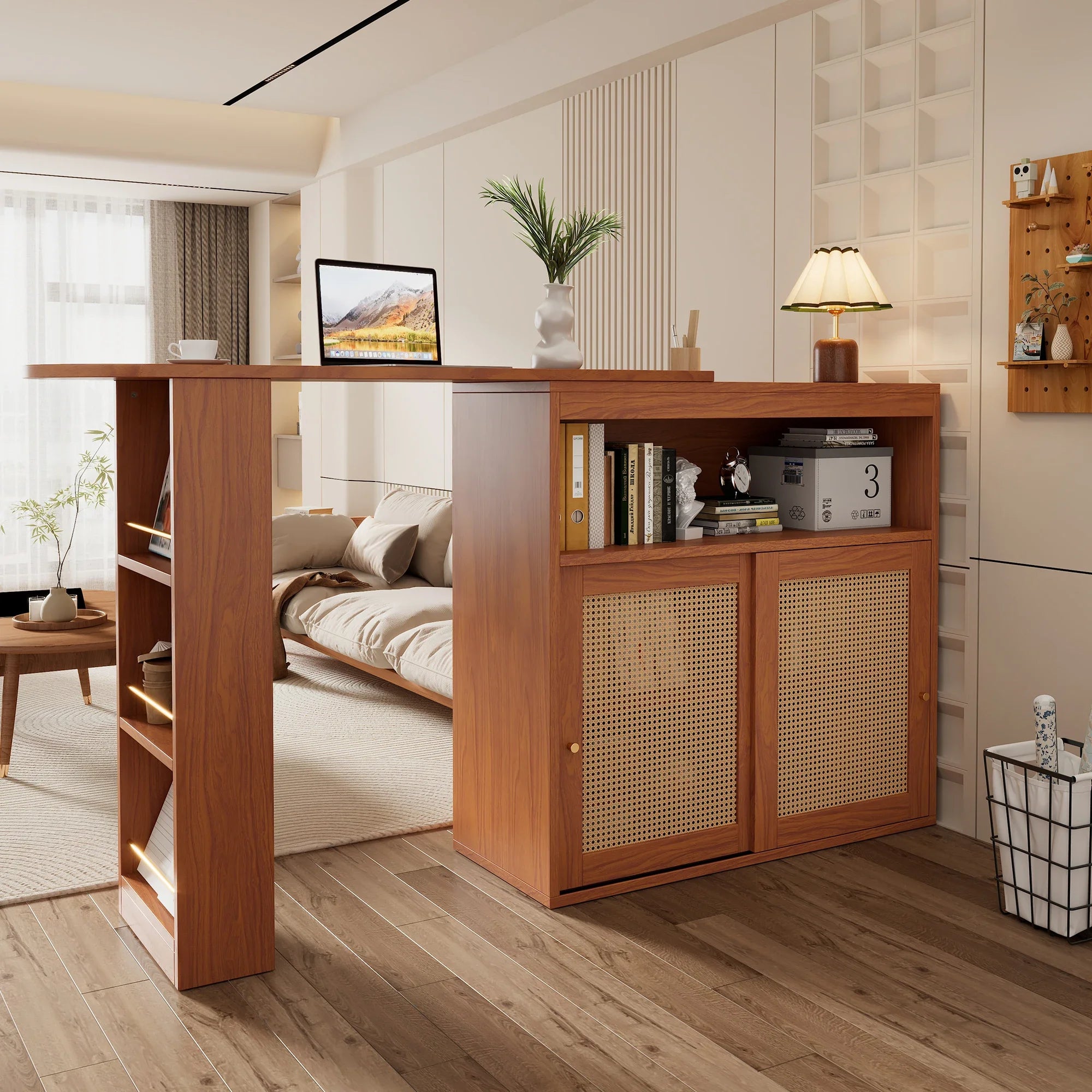Επεκτεινόμενο τραπέζι μπαρ με ρυθμιζόμενα ράφια είναι ένα πολυλειτουργικό νησίδα κουζίνας που συνδυάζει πρακτική αποθήκευση με μοντέρνα αισθητική. Λεπτομέρειες από χειροποίητο ψάθινο υλικό και ανθεκτική επιφάνεια MDF προσφέρουν μια φυσική, κομψή εμφάνιση που ταιριάζει σε τραπεζαρίες, ανοιχτούς χώρους κουζίνας ή χώρους ψυχαγωγίας. Το μήκος του τραπεζιού επεκτείνεται από 138 εκ έως 193 εκ, επιτρέποντάς σας να φιλοξενήσετε εύκολα καλεσμένους, ενώ το συμπαγές πλάτος 39 εκ και το ύψος 104 εκ το κρατούν άνετο σε στενούς χώρους. Το πλαίσιο συνδυάζει MDF και χειροποίητο ψάθινο υλικό για ανθεκτικότητα, και τα εσωτερικά ράφια μαζί με τις ελεύθερα αναδιπλούμενες πόρτες ντουλαπιού παρέχουν ευέλικτη αποθήκευση για ποτήρια, βιβλία μαγειρικής ή σερβίτσια. Είτε διοργανώνετε μια χαλαρή βραδιά κρασιού είτε δημιουργείτε έναν λειτουργικό χώρο εργασίας με χαρακτήρα, αυτό το τραπέζι μπαρ προσαρμόζεται στον τρόπο ζωής σας ως μπαρ, τραπέζι φαγητού ή ράφι προβολής. Όλος ο ηλεκτρονικός και μηχανικός εξοπλισμός, συσκευές και μηχανές που πωλούνται από την InterCyprus σε χώρες της ΕΕ είναι πιστοποιημένα CE και φέρουν εγγύηση δύο ετών. Παρέχοντας ποιοτική και αξιόπιστη υπηρεσία από το 2002 στο intercyprus.com.