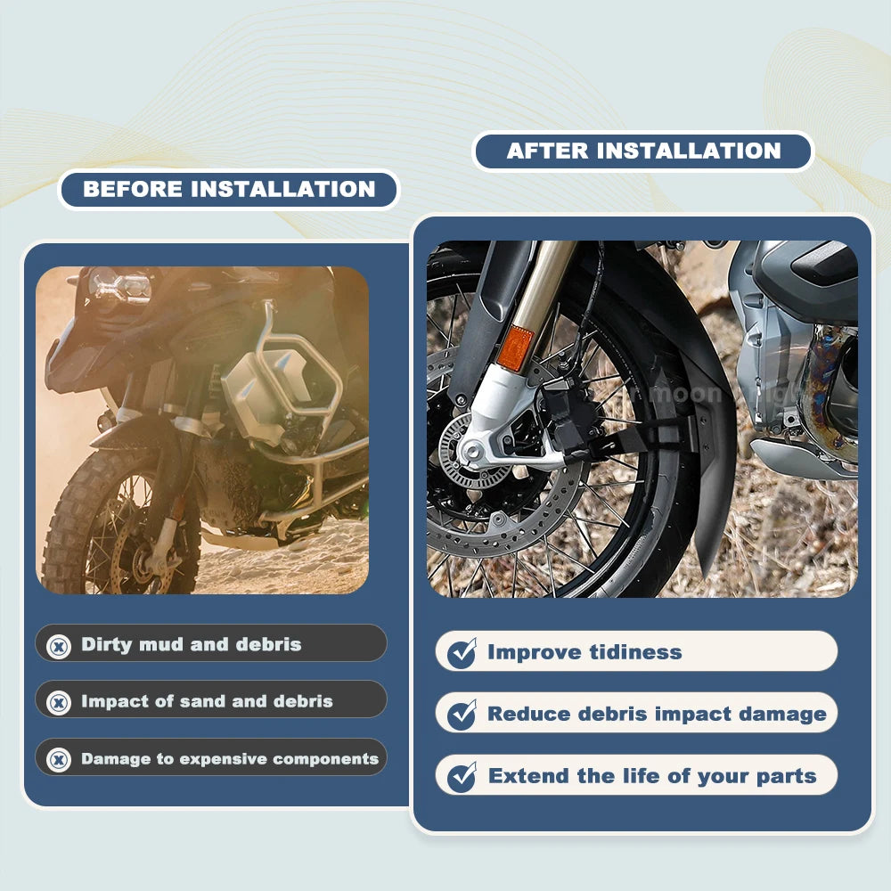 Σχεδιασμένος για μια ευρεία γκάμα περιπετειωδών μοτοσυκλετών BMW, αυτός ο επεκτατικός προσθέτει προστασία χωρίς να αλλάζει την εμφάνιση της μοτοσυκλέτας. Επεκτείνει τον μπροστινό φτερό κατά 26 εκ (10.23 in), χρησιμοποιώντας ανθεκτικό ABS σε συνδυασμό με ανθρακοχάλυβα για μια ανθεκτική αλλά ελαφριά ασπίδα. Η επέκταση είναι προσαρμοσμένη για να ταιριάζει στην οικογένεια BMW R 1200 GS (2013–2018) και στην οικογένεια BMW R 1250 GS (2019–2024), συμπεριλαμβανομένων των εκδόσεων Adventure, Rallye και Exclusive, εξασφαλίζοντας αξιόπιστη κάλυψη εκεί που χρειάζεται περισσότερο, διατηρώντας παράλληλα μια καθαρή, ενσωματωμένη εμφάνιση.