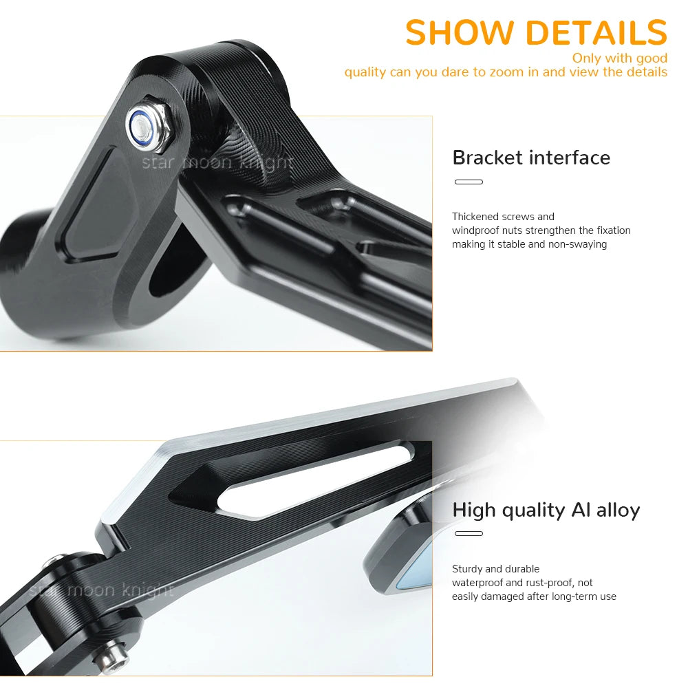 Το γυαλί υψηλής ευκρίνειας παρέχει καθαρή και ευκρινή εικόνα τόσο κατά την ημέρα όσο και τη νύχτα, με αντιθαμβωτική επιφάνεια που μειώνει την αντανάκλαση από τα φώτα των οχημάτων πίσω σας. Το σταθερό τμήμα του καθρέφτη έχει σχεδιαστεί ειδικά για supersport/adventure μοτοσυκλέτες και λειτουργεί με σύστημα περιστροφής που διατηρεί την εγκατάσταση ασφαλή ενώ επιτρέπει εύκολη ευθυγράμμιση. Στην κλειστή θέση, ο καθρέφτης μετατρέπεται σε αεροδυναμικό φύλλο, βοηθώντας στη βελτίωση της συνολικής αεροδυναμικής της μοτοσυκλέτας. Κατασκευασμένοι από ανθεκτικό κράμα αλουμινίου και φινιρισμένοι σε μαύρο ή ασημί, αυτοί οι καθρέφτες είναι σχεδιασμένοι να αντέχουν στις απαιτήσεις μεγάλων διαδρομών και μεταβαλλόμενων καιρικών συνθηκών.