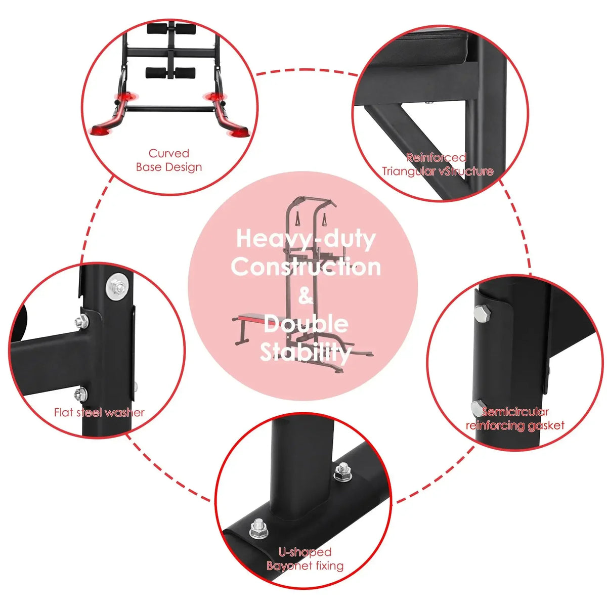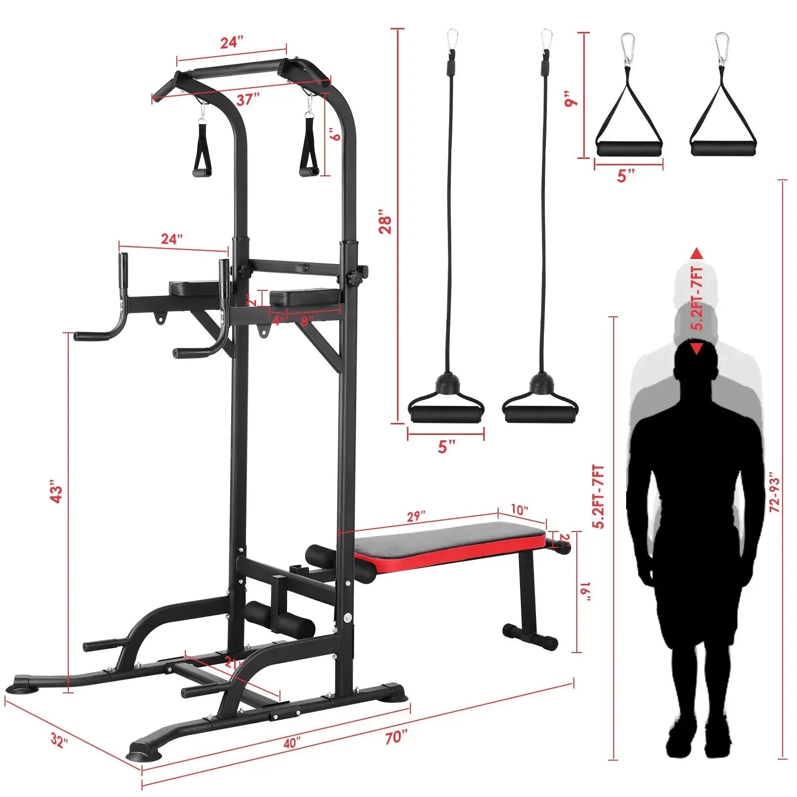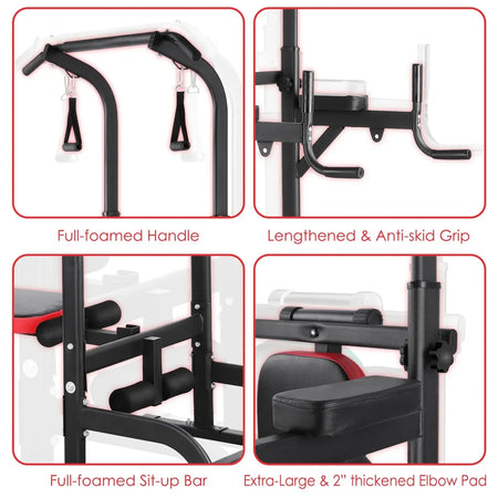 Από το στήθος και την πλάτη μέχρι τους ώμους, τον κορμό και τα πόδια, αυτός ο πολυλειτουργικός σταθμός γυμναστικής παρέχει απεριόριστες επιλογές άσκησης. Ο πύργος δύναμης διαθέτει ρυθμιζόμενο εύρος ύψους από 181 εκ έως 234 εκ, επιτρέποντας σε χρήστες διαφορετικών αναστημάτων να εκτελούν έλξεις, βυθίσεις, κάμψεις και άλλα με σωστή τεχνική. Η εξαιρετικά μακριά βάση σε σχήμα Η και τα τέσσερα διευρυμένα αντιολισθητικά μαξιλαράκια προστατεύουν το πάτωμά σας και ενισχύουν τη σταθερότητα κατά τη διάρκεια απαιτητικών σετ.