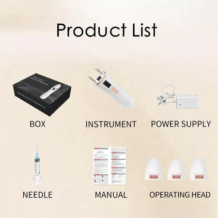 - Συμπεριλαμβάνονται στη Λίστα Προϊόντων: 1 Κουτί, 1 Όργανο, 1 Τροφοδοτικό, 1 Βελόνα, 1 Εγχειρίδιο, 3 Κεφαλές Λειτουργίας
