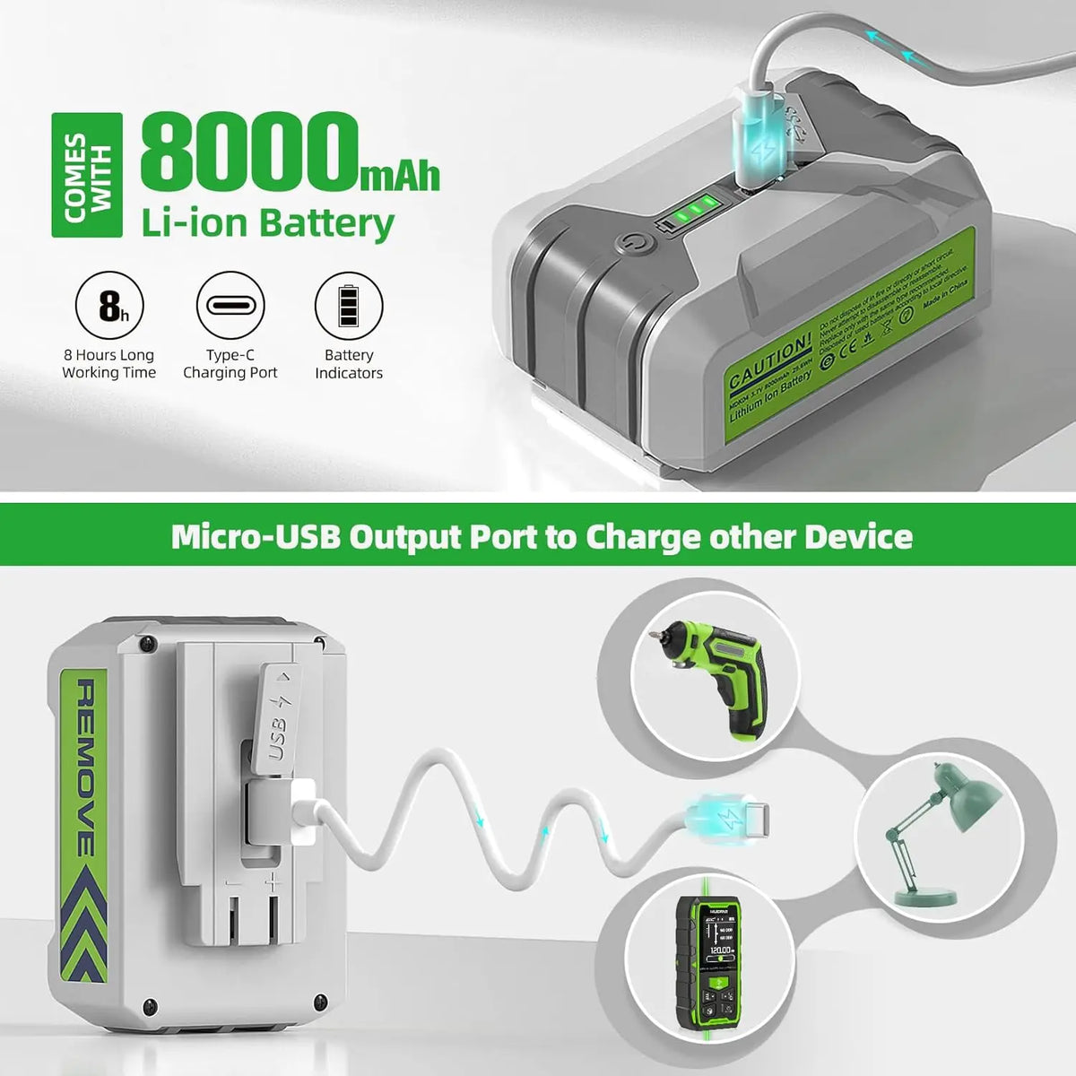 - Τροφοδοσία: 3.7V / 8000mAh Li‑Ion μπαταρία