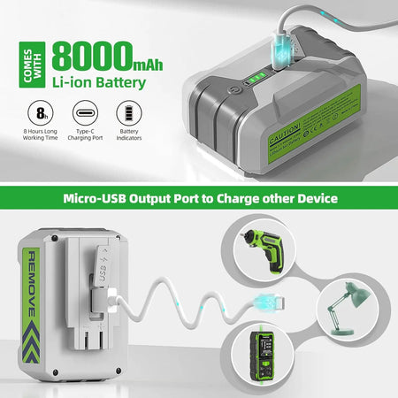 - Ενέργεια όλη μέρα και φορητή εγκατάσταση: Η μπαταρία 8000mAh Li‑ion υποστηρίζει περίπου 8 ώρες συνεχούς χρήσης με όλες τις δέσμες ενεργές; χρησιμοποιήστε το τηλεχειριστήριο και τη βάση ανύψωσης για βολικές ρυθμίσεις από απόσταση.