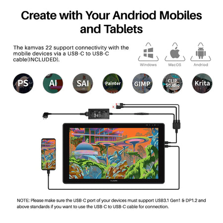 Η συνδεσιμότητα είναι ευέλικτη και βολική. Το Kamvas 22 παρέχει δύο θύρες USB-C: μια θύρα 3-σε-1 USB-C για σήμα HDMI και τροφοδοσία, και μια πλήρως λειτουργική θύρα USB-C για σήμα DP. Υποστηρίζει Windows 7 ή νεότερα, macOS 10.12 ή νεότερα, Android (USB 3.1 Gen1, DP1.2) και Linux, διευκολύνοντας τη σύνδεση με επιτραπέζιους υπολογιστές, φορητούς υπολογιστές, ταμπλέτες και συμβατά τηλέφωνα. Μια επιλογή σύνδεσης USB-C τριών σε ένα απλοποιεί τη ρύθμιση, ενώ η πλήρως λειτουργική θύρα USB-C επεκτείνει τη ροή εργασίας σας σε κινητές συσκευές όταν είναι διαθέσιμες. Για καλύτερη απόδοση, βεβαιωθείτε ότι η θύρα USB-C στη συσκευή σας υποστηρίζει μεταφορά δεδομένων USB3.1 Gen1 και DP1.2.