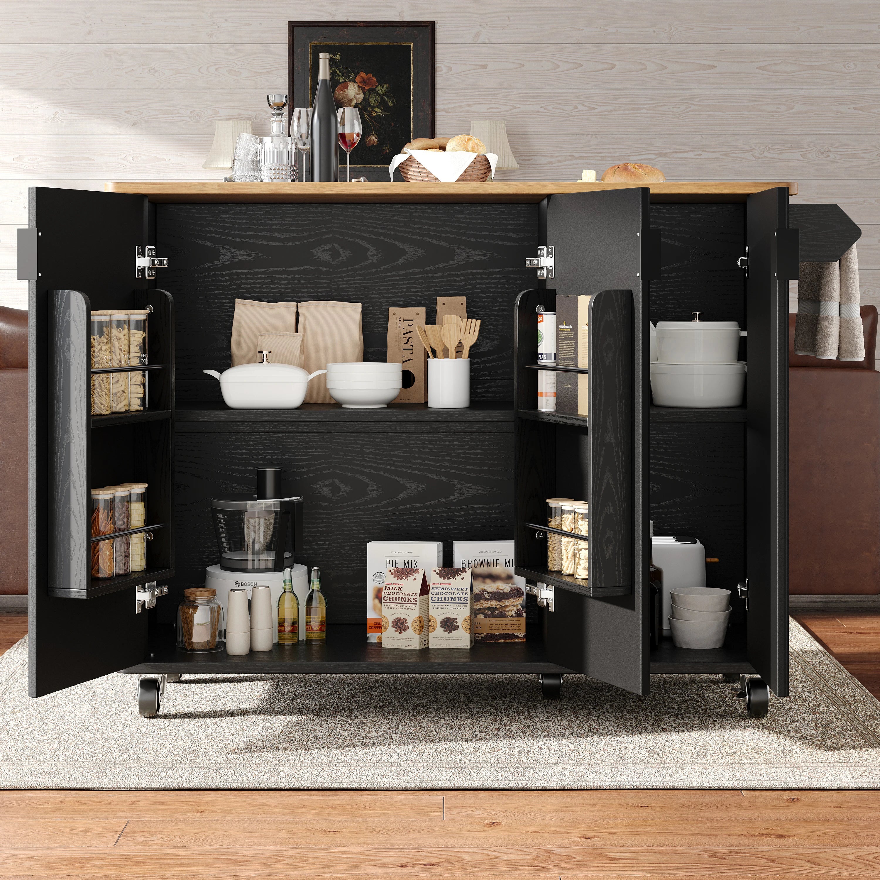 Σχεδιασμένο για σύγχρονα σπίτια, κρατά τα απαραίτητα σε απόσταση βολής: τρεις πόρτες με ρυθμιζόμενα ράφια προσφέρουν ευέλικτη αποθήκευση για κατσαρόλες, τηγάνια ή ξηρά προϊόντα· μια κρεμάστρα πετσετών κρατά τα καθαριστικά κοντά· και μια ενσωματωμένη θήκη μπαχαρικών βοηθά στην οργάνωση των μπαχαρικών για γρήγορη πρόσβαση κατά το μαγείρεμα. Με πέντε ροδάκια περιστροφής 360 μοιρών—δύο από τα οποία μπορούν να κλειδωθούν—μπορείτε να το μετακινήσετε μεταξύ κουζίνας, τραπεζαρίας ή σαλονιού όπως χρειάζεται, και μετά να το κλειδώσετε στη θέση του για σταθερότητα κατά τη χρήση.