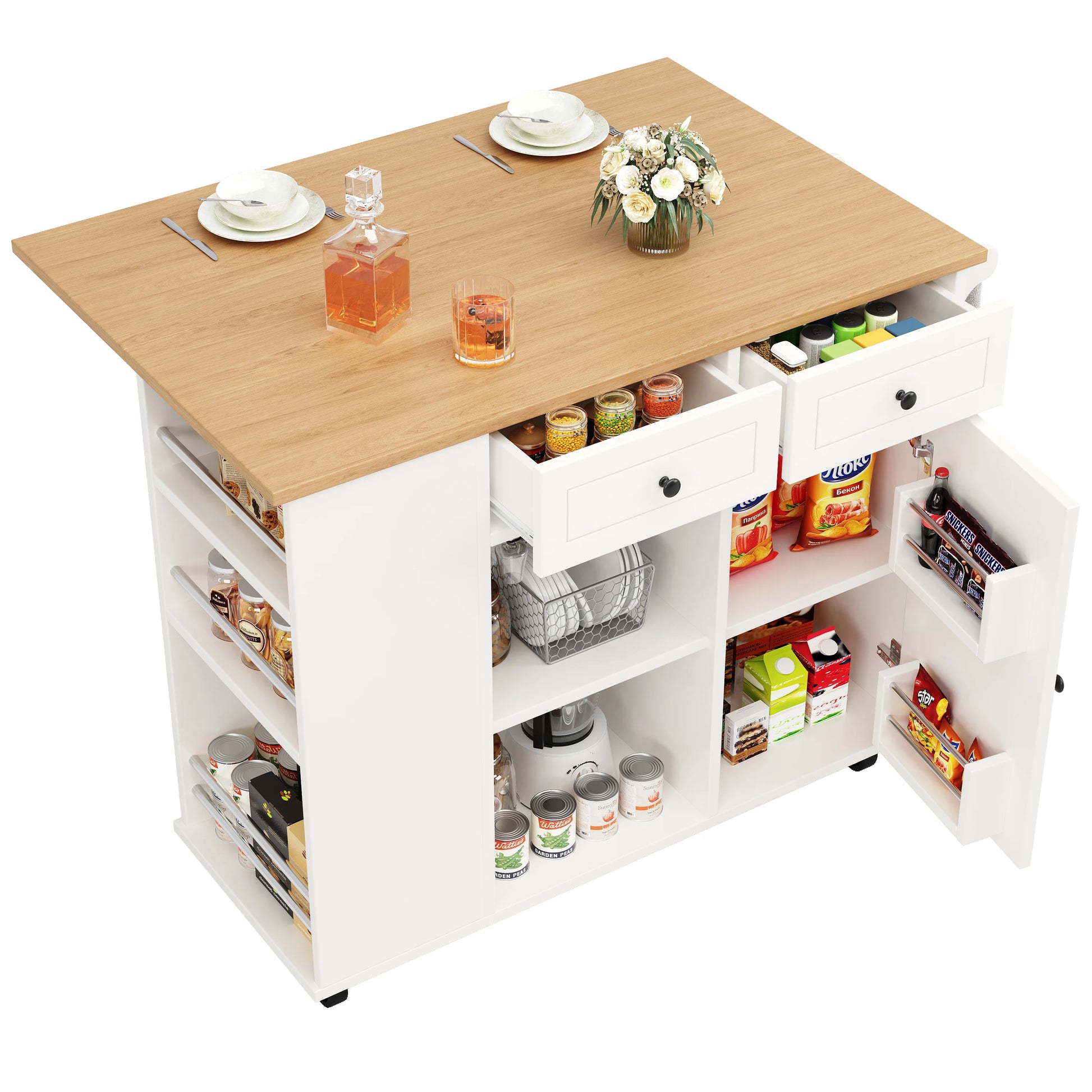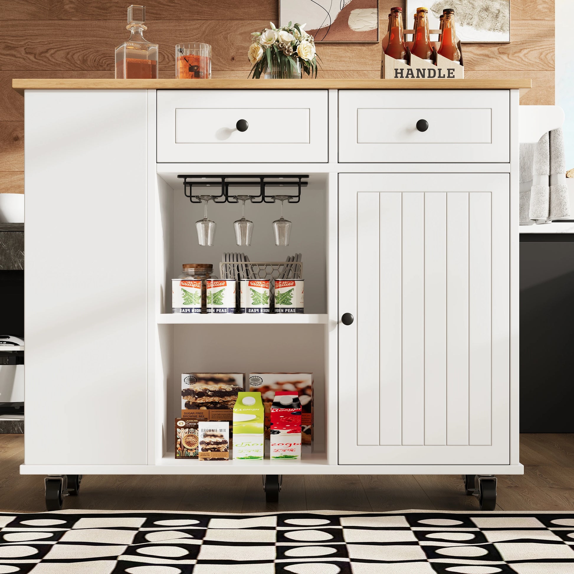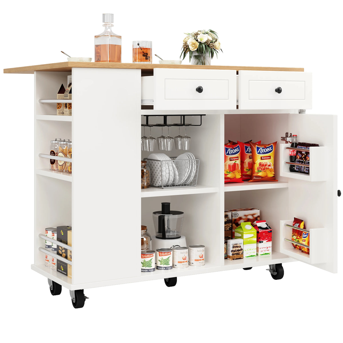 Σχεδιασμένο για οργάνωση και ευκολία χρήσης, διαθέτει ράφι για ποτήρια κρασιού για ασφαλή αποθήκευση, ράφι για σνακ στην πόρτα του ντουλαπιού για γρήγορη πρόσβαση και πλαϊνό ράφι για καθημερινά απαραίτητα. Ο εσωτερικός διαχωριστής μπορεί να ρυθμιστεί σε τρία επίπεδα, επιτρέποντας ευέλικτο χώρο για κατσαρόλες, μπολ, υλικά ή σνακ. Μια ευρύχωρη περιοχή αποθήκευσης βοηθά να διατηρούνται τα σκεύη και ο εξοπλισμός κουζίνας τακτοποιημένα, μειώνοντας την ακαταστασία και βελτιώνοντας τη συνολική αποδοτικότητα της κουζίνας. Η κινητικότητα είναι εύκολη χάρη στους τροχούς που περιστρέφονται 360 μοιρών, ώστε να μπορείτε να μετακινείτε το νησί στην τέλεια θέση στην κουζίνα ή την τραπεζαρία σας με ελάχιστη προσπάθεια.