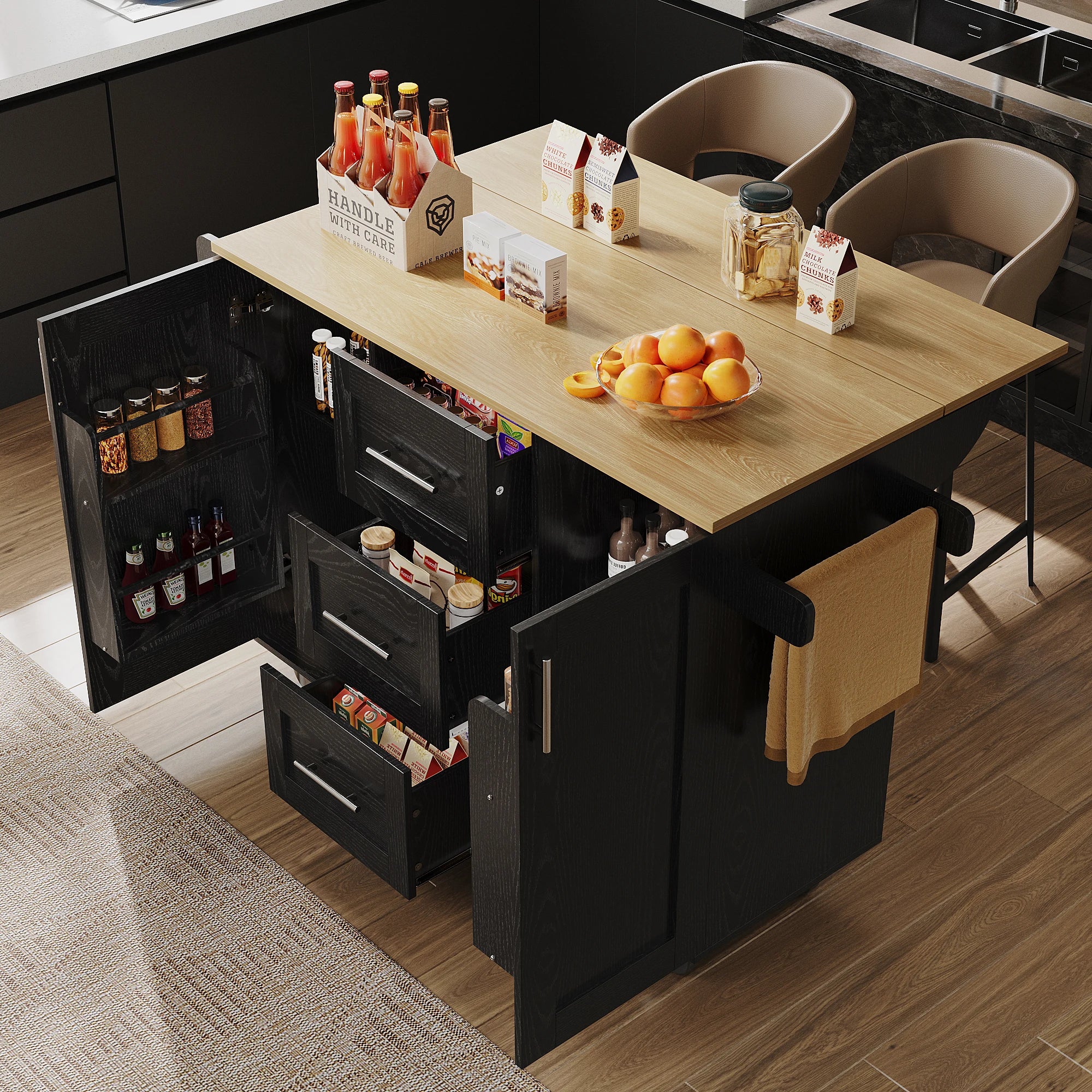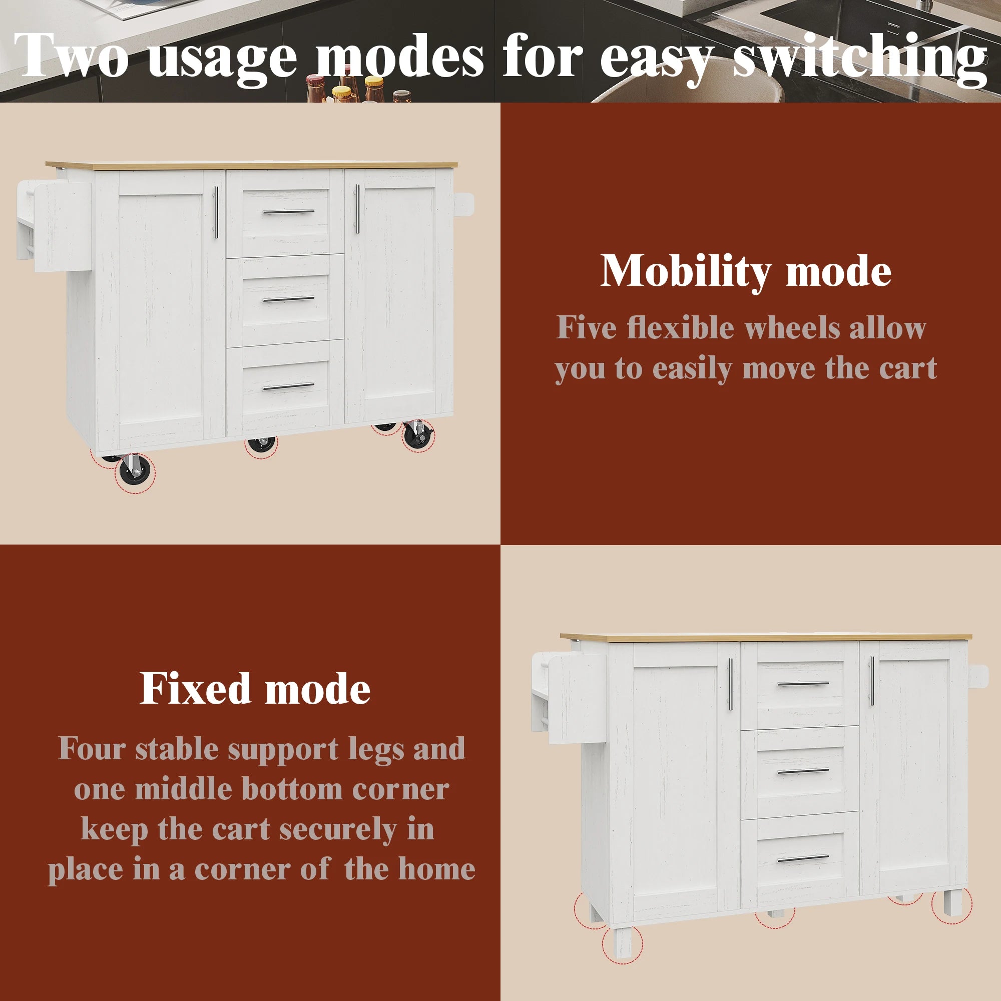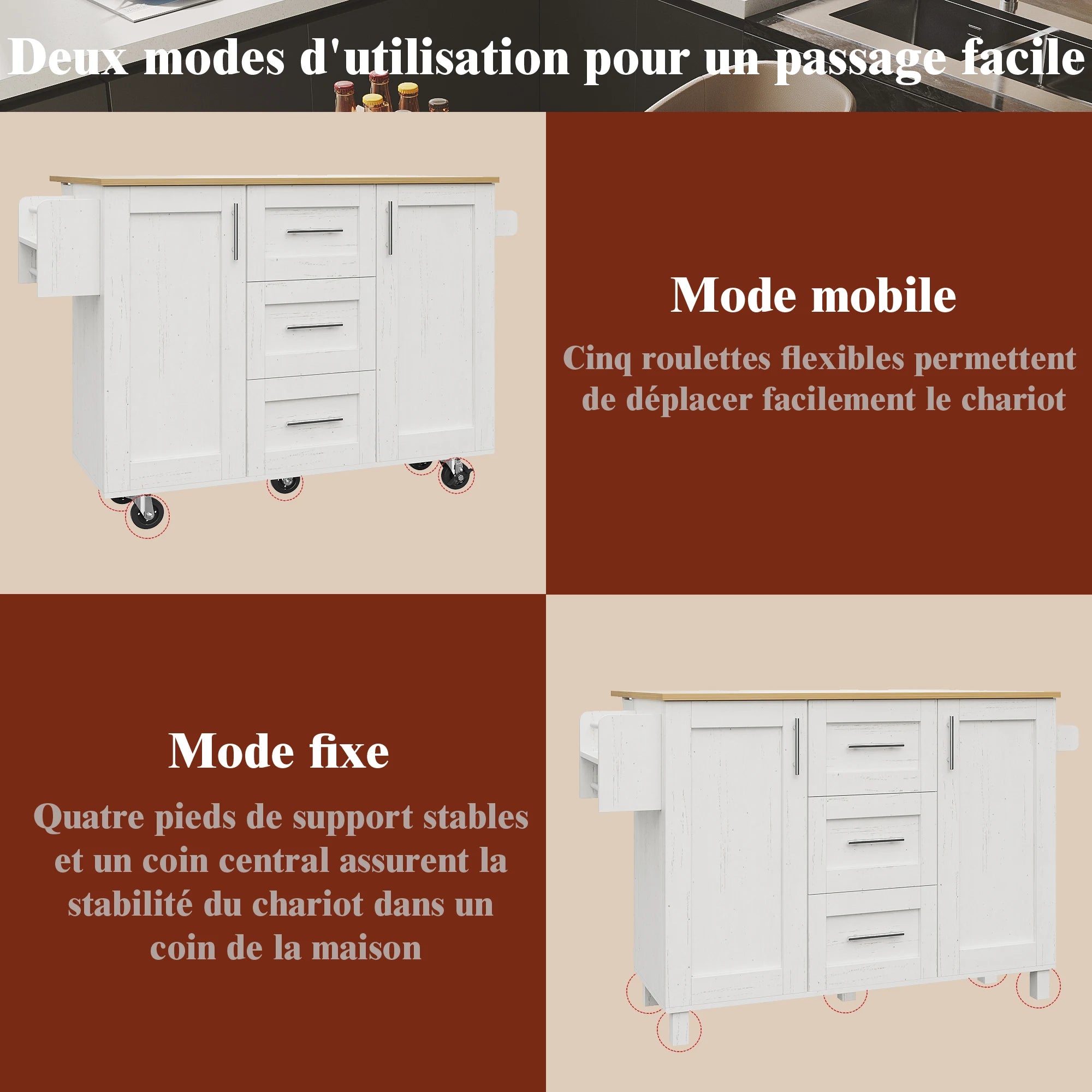 Κατασκευασμένος με υψηλής ποιότητας πυκνό ξύλινο πάγκο, ο πάγκος είναι φτιαγμένος να αντέχει την καθημερινή χρήση—ιδανικός για κοπή λαχανικών, προετοιμασία γευμάτων και άλλες εργασίες κουζίνας. Η αποθήκευση είναι προσεκτικά σχεδιασμένη: τρία ευρύχωρα συρτάρια με κομψή λαβή από κράμα ψευδαργύρου για εύκολη πρόσβαση, συν ένα ράφι σνακ πάνω από την πόρτα για μπαχαρικά, σνακ ή μικρά αντικείμενα. Ένα πρακτικό ράφι για πετσέτες προσθέτει ακόμα περισσότερη ευκολία, κρατώντας τις πετσέτες κοντά ενώ μαγειρεύετε. Πέντε κλειδωμένοι τροχοί εξασφαλίζουν ομαλή κίνηση και σταθερότητα όταν χρειάζεται, καθιστώντας εύκολη την αναδιάταξη ή τη μετακίνηση του νησιού για καθαρισμό ή ψυχαγωγία.