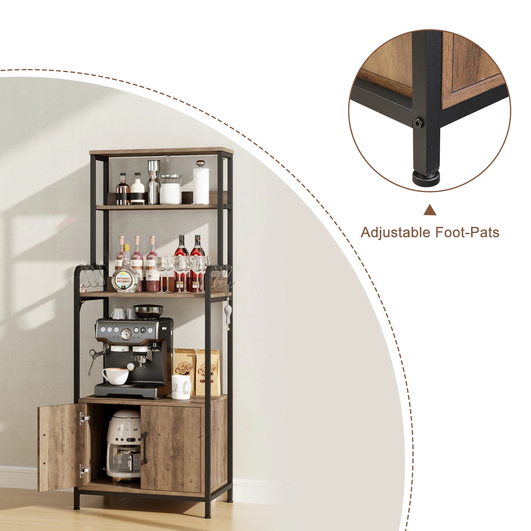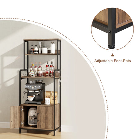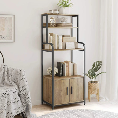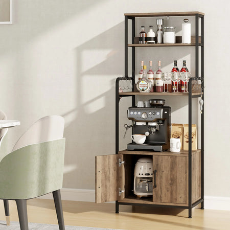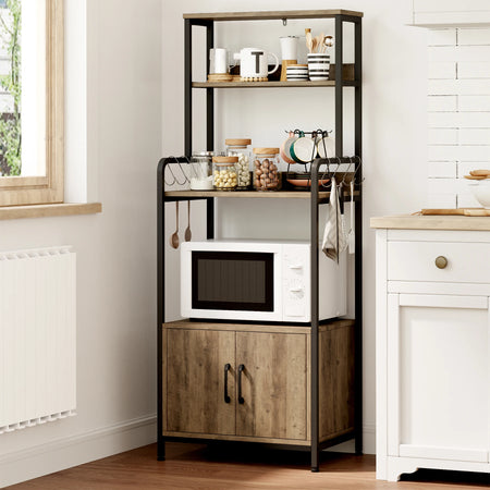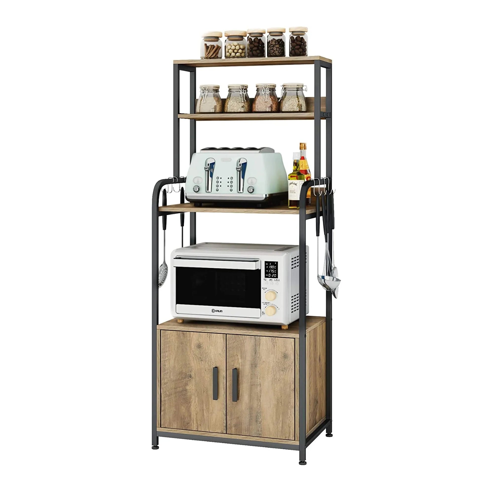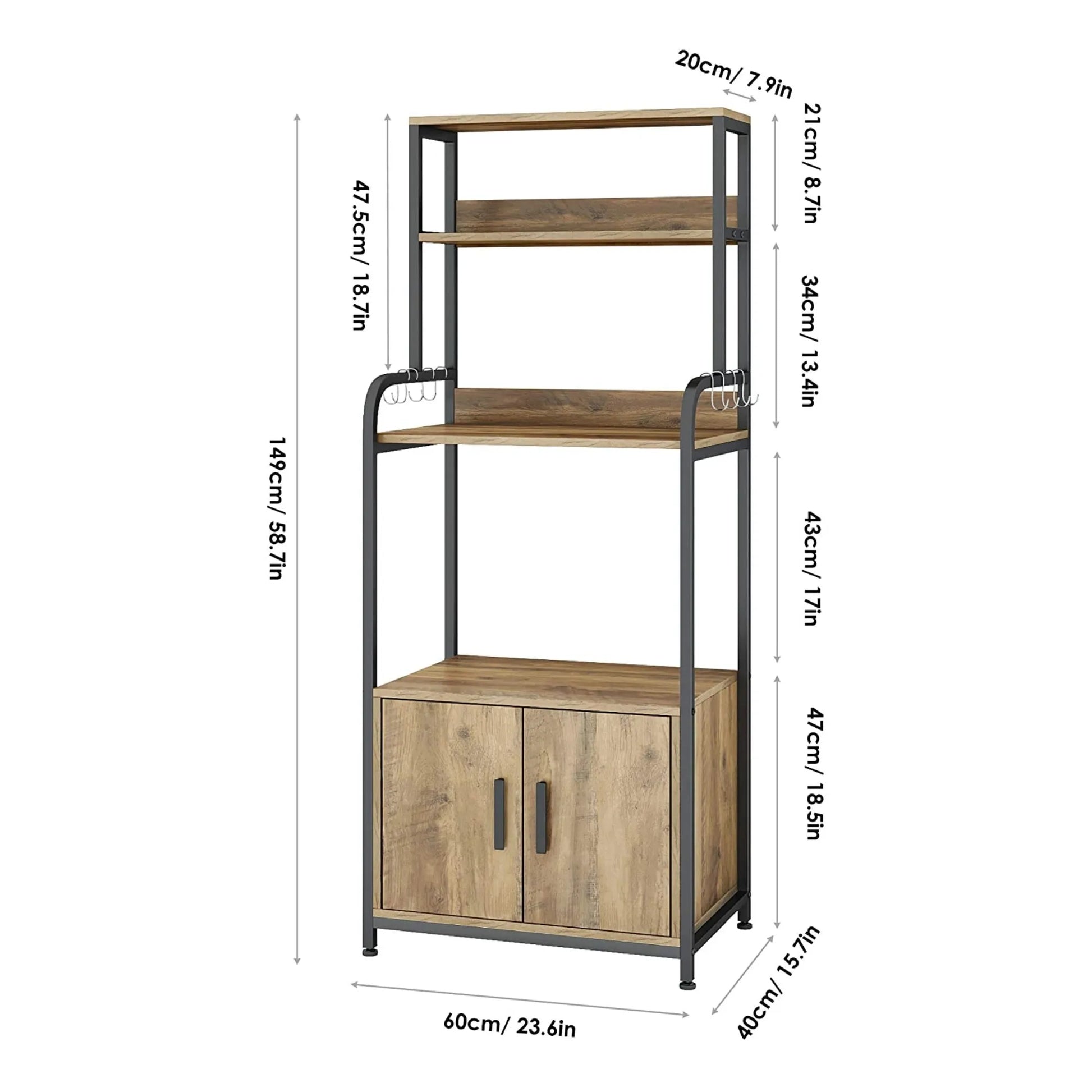 Ο σχεδιασμός συνδυάζει ένα ρετρό σκούρο καφέ ξύλινο σχέδιο με ένα στιβαρό μαύρο μεταλλικό πλαίσιο, καθιστώντας το μια εντυπωσιακή προσθήκη σε κουζίνες, σαλόνια, φοιτητικές εστίες, γκαράζ ή καφετέριες. Τα δύο πάνω στενά ράφια είναι ιδανικά για μπαχαρικά και μικρά μπουκάλια, το μεσαίο ράφι φιλοξενεί πιάτα ή μπολ, και το κάτω ντουλάπι με πόρτα προστατεύει τα τρόφιμα από υγρασία και σκόνη ενώ αφήνει άφθονο χώρο πάνω για συσκευές όπως φούρνους μικροκυμάτων και φούρνους. Αυτό το ντουλάπι-ράφι σε στυλ ντουλαπιού μεγιστοποιεί την αποθήκευση χωρίς να καταλαμβάνει πολύτιμο χώρο στο πάτωμα.