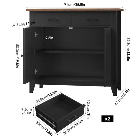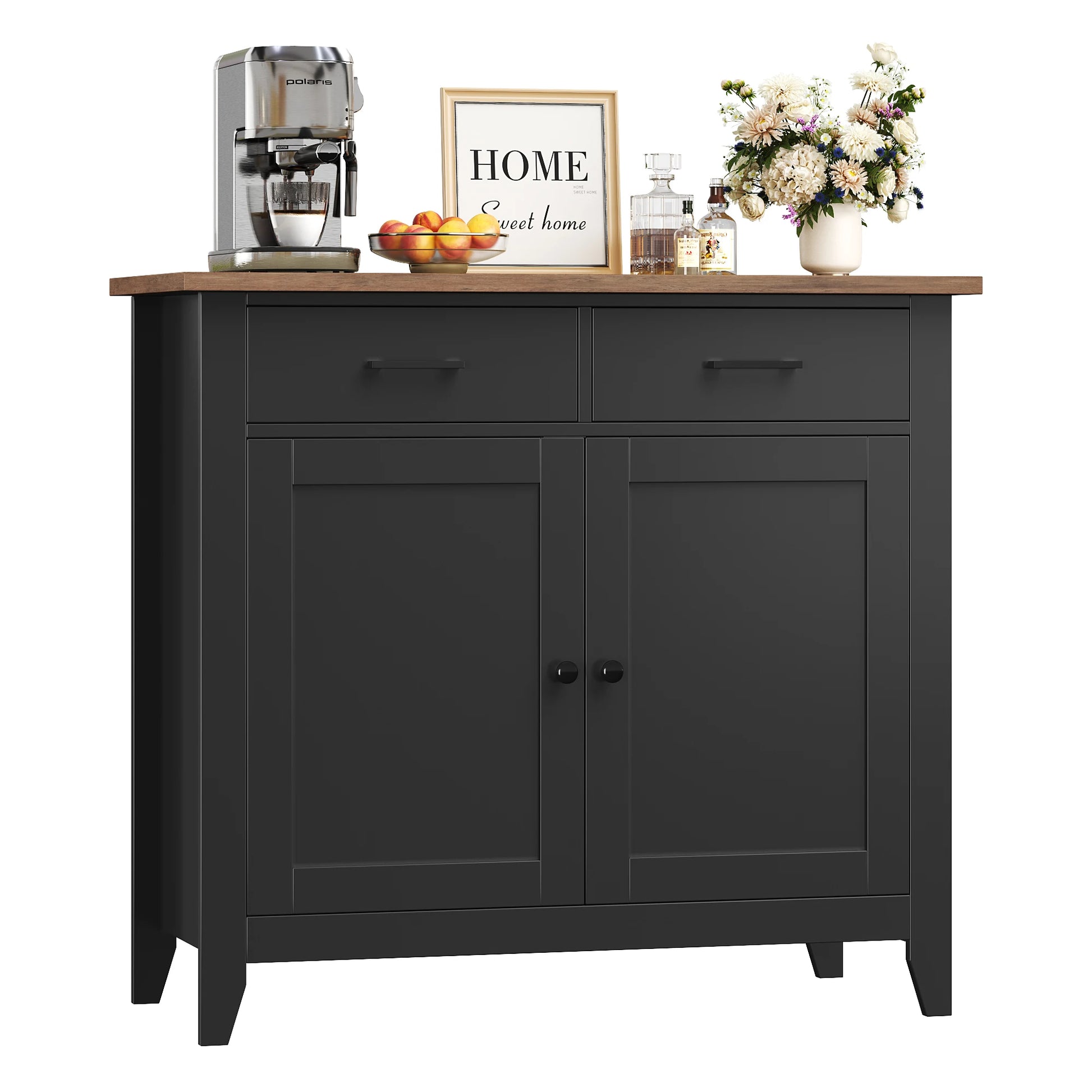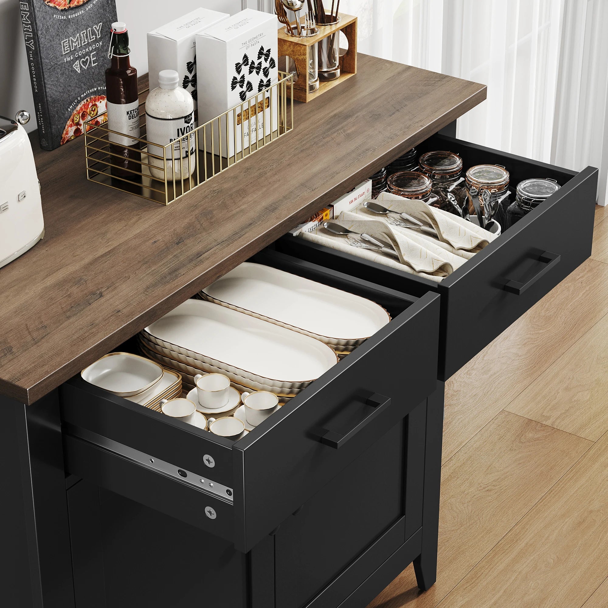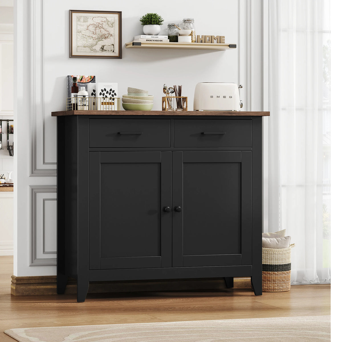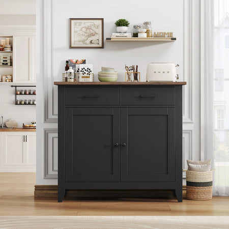 Ο πολυλειτουργικός σχεδιασμός του περιλαμβάνει δύο συρτάρια και ένα ντουλάπι πίσω από την πόρτα με παχύ πάτο που παραμένει σταθερός για χρόνια. Η καφέ επιφάνεια εργασίας σε συνδυασμό με την λευκή/μαύρη ντουλάπα και τις μαύρες λαβές δημιουργούν μια διαχρονική τριχρωμία που ταιριάζει με τη διακόσμηση της κουζίνας, του διαδρόμου ή του καθιστικού. Αυτό το αυτόνομο κομμάτι λειτουργεί επίσης ως συμπαγές νησίδα κουζίνας για βολική προετοιμασία και σερβίρισμα κατά τη διάρκεια γευμάτων και συγκεντρώσεων.